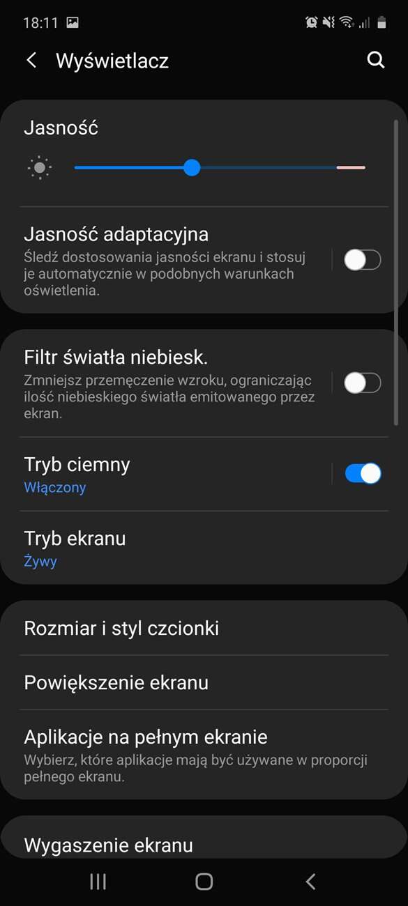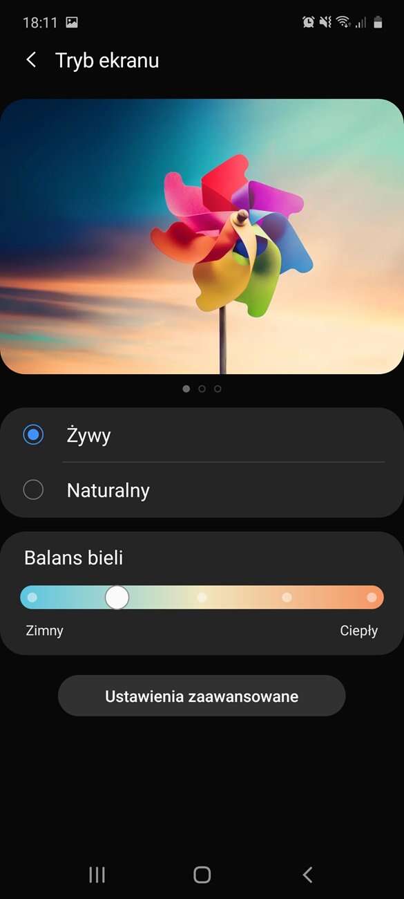 W ustawieniach znajdziemy filtr światła niebieskiego, Always on Display, tryb ciemny dla menu oraz możliwość regulacji nasycenia barw.