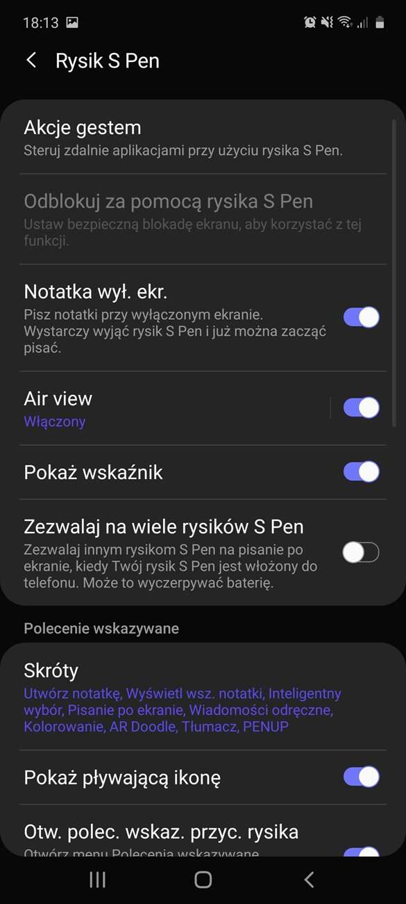 Gwiazdą jest tu oczywiście rysik S-Pen i możliwości jakie on daje. Jest to rysik starszego typu, tzn. wzięty z Note 9, podobnie jak procesor czy układ graficzny. Nie oferuje on wszystkich funkcjonalności z Note 10+, ale z Note 9 – już tak. Z istotniejszych wymienić należy: