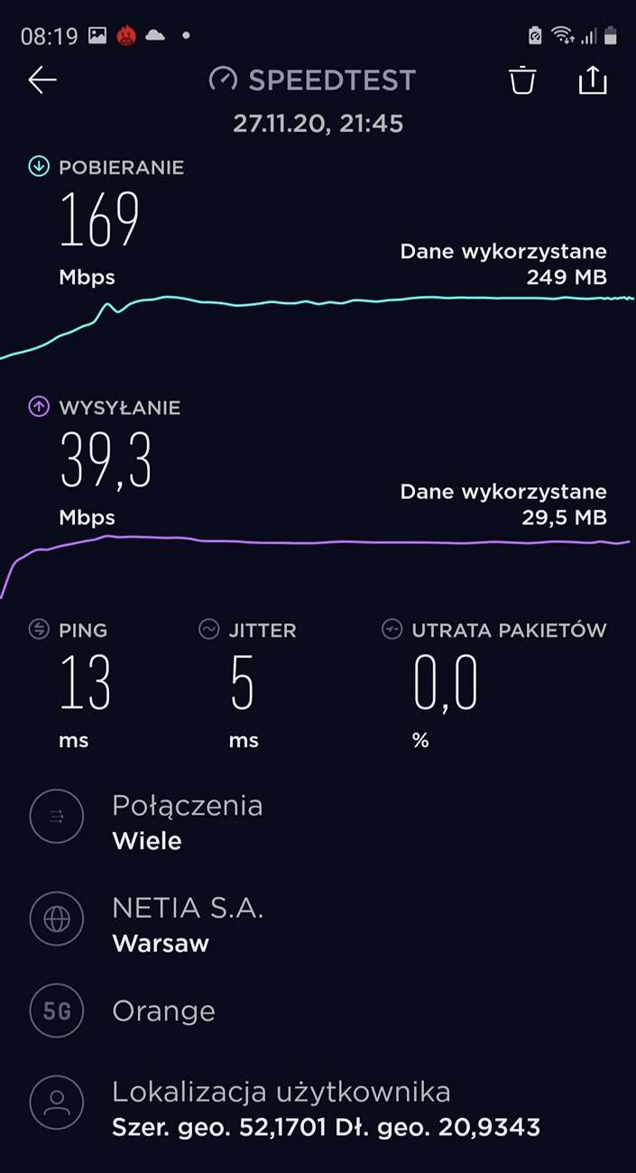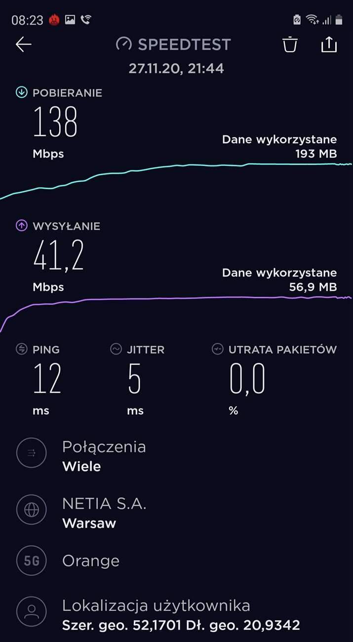 W tej kategorii nie mamy większych powodów do narzekań, podobnie zresztą jak w przypadku innych urządzeń z rodziny S20. Smartfon jest Dual-SIMem, wspiera karty pamięci do 1 TB (choć tu akurat musimy wybierać między drugą kartą nanoSIM a microSD) oraz oczywiście 5G. Prędkości internetu jakie udało mi się uzyskać w Warszawie w sieci Orange nie są może mistrzostwem świata, ale tragedii nie ma 😉 Szczegóły na screenach poniżej.