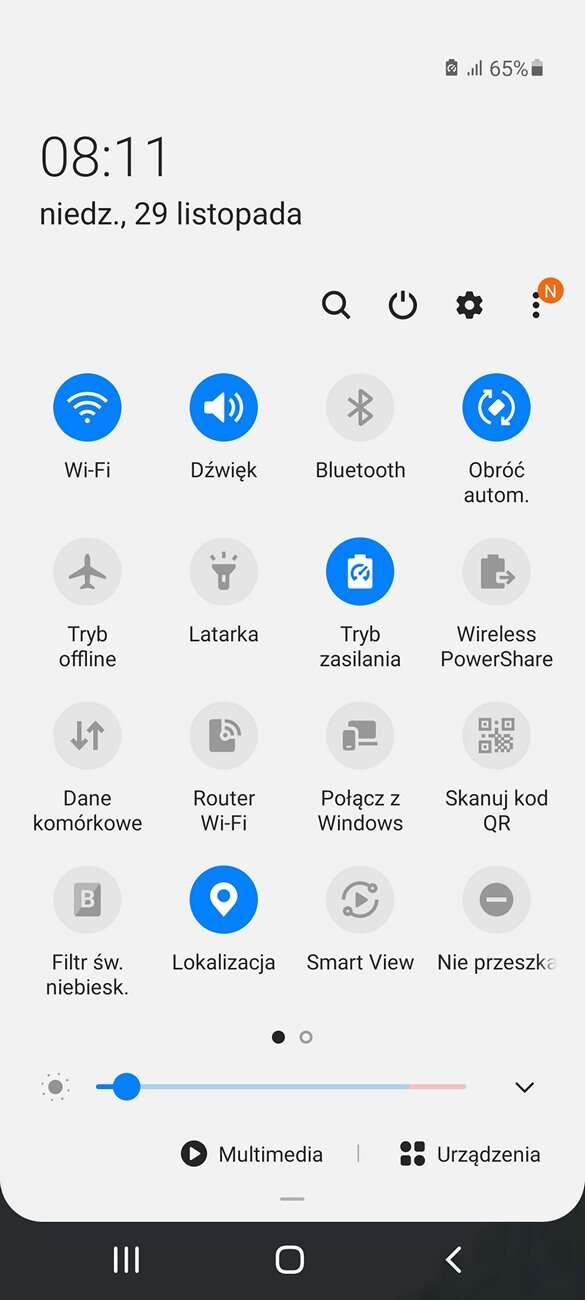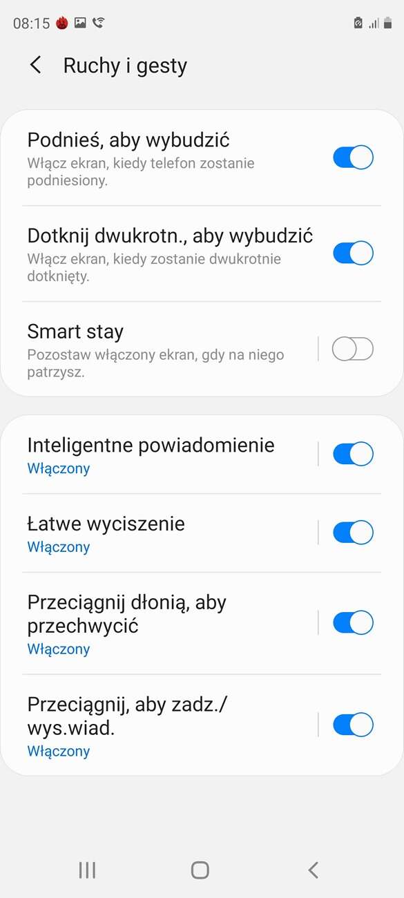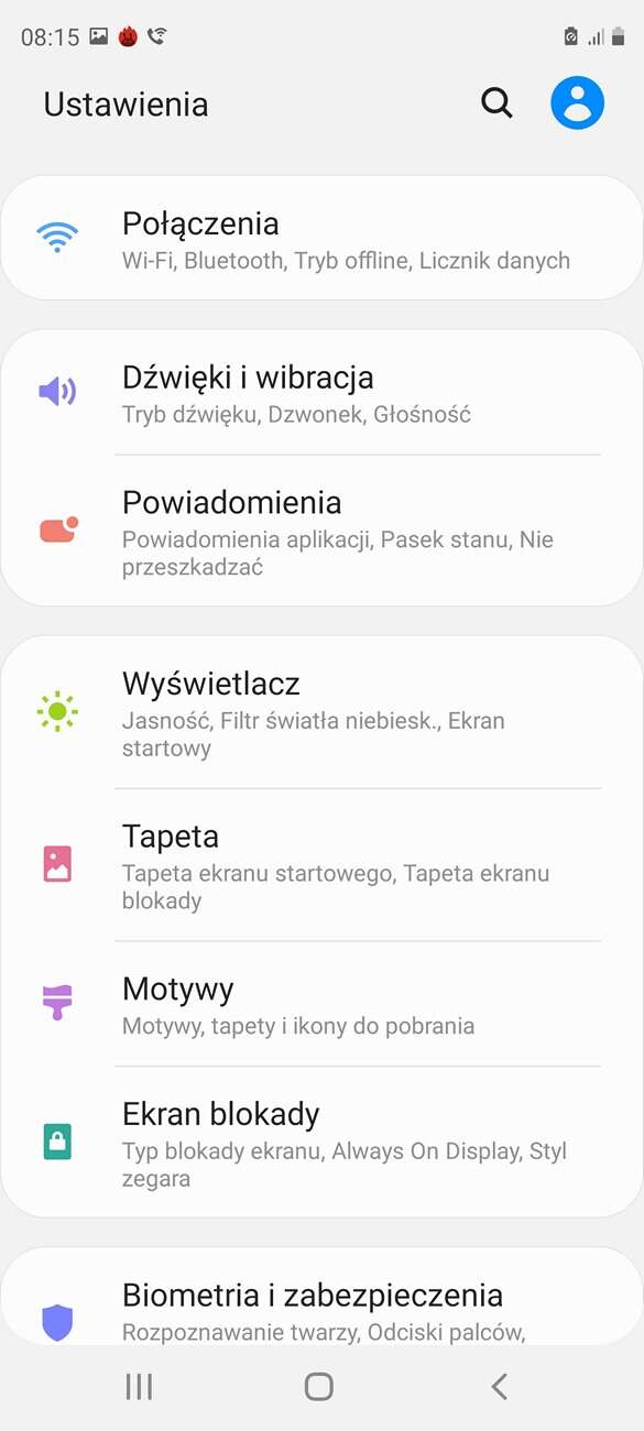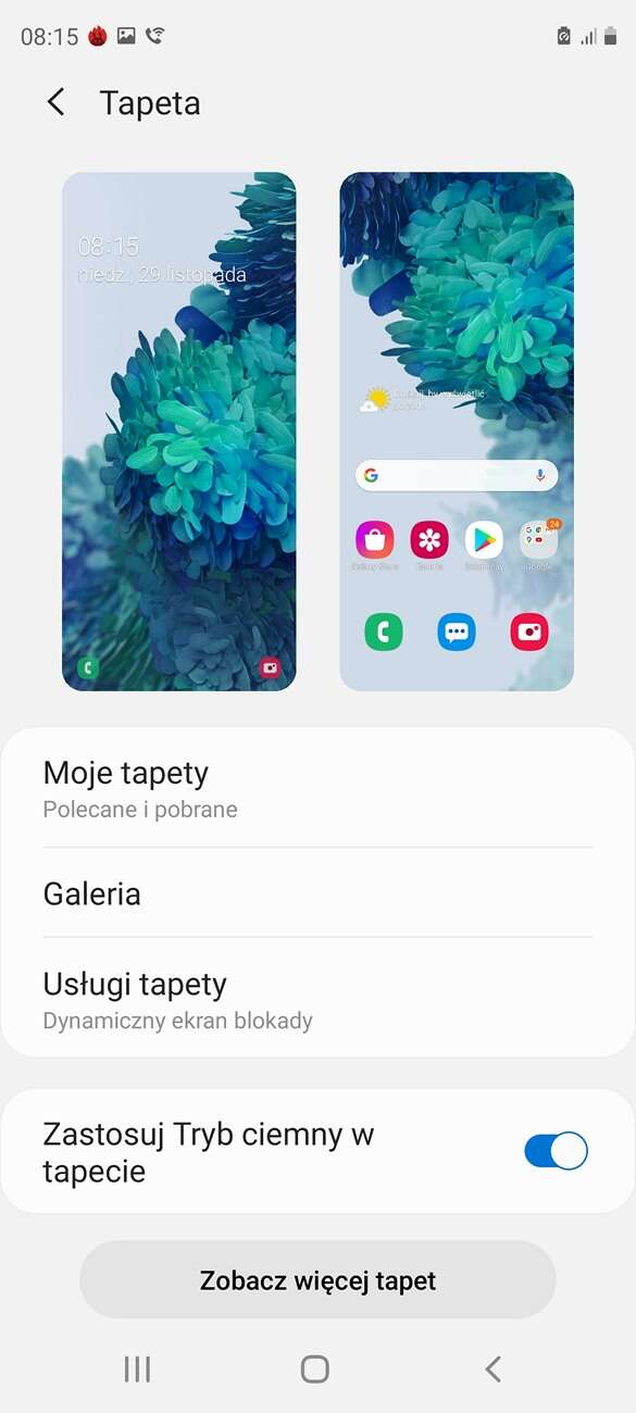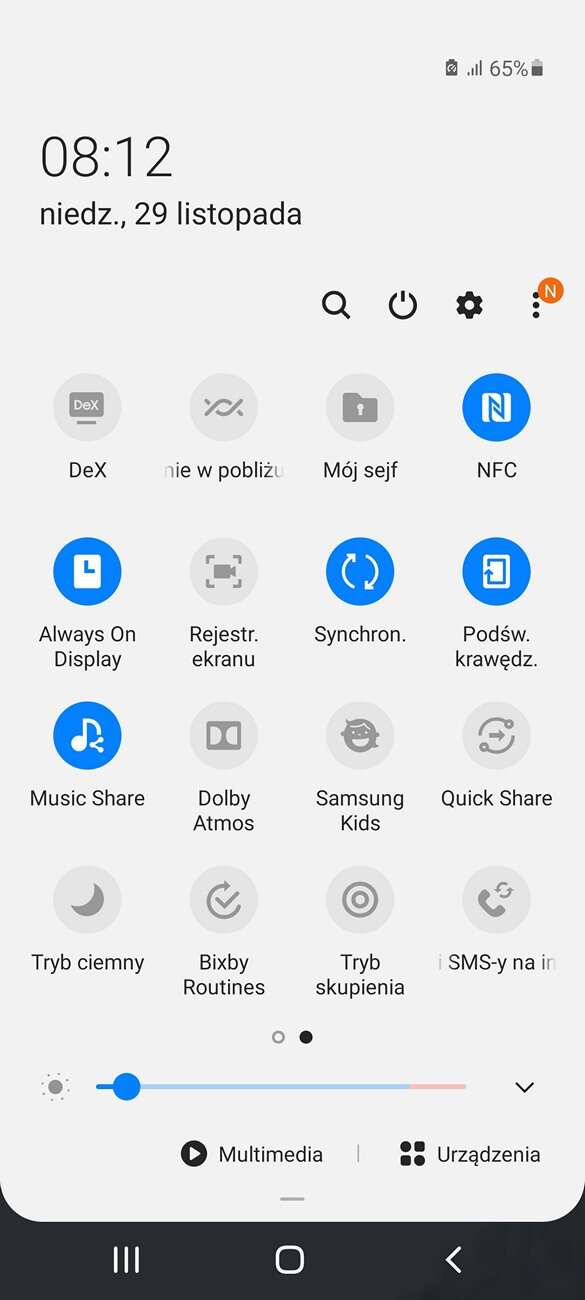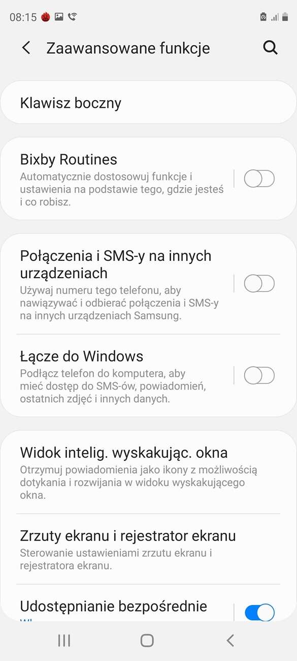 W ustawieniach znajdziemy obsługę motywów, gestów i tzw. ekranu krawędziowego (wybrane aplikacje dostępne są po przesunięciu palcem od krawędzi). Jest również asystent Bixby, a dedykowany mu przycisk można dowolnie programować. Z poziomu ikon wysuwanych z górnej belki można włączyć skaner kodów QR, połączyć smartfon ze stacją dokującą DEX, a także włączyć nagrywanie ekranu.