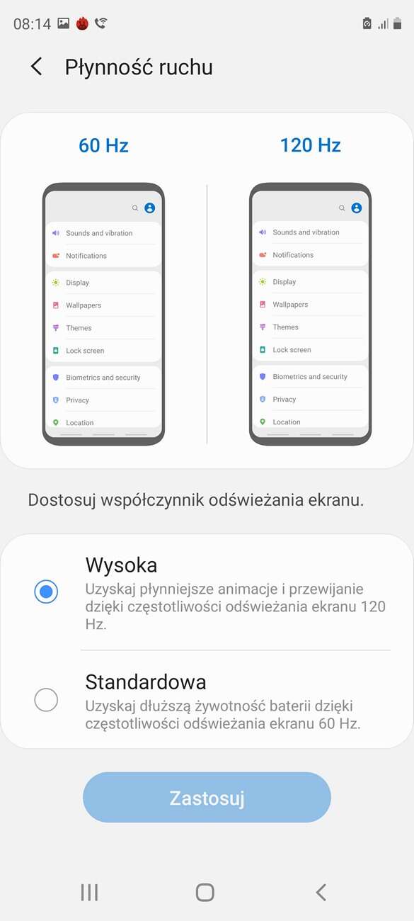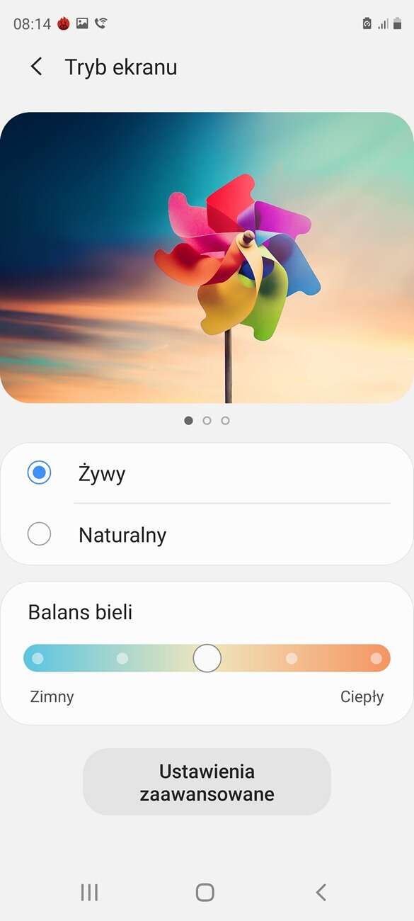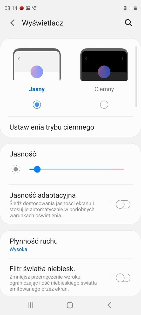 W ustawieniach znajdziemy oczywiście tryb ciemny dla menu, możliwość włączenia Always On Display, filtr światła niebieskiego i możliwość regulacji balansu bieli. Możemy się również przełączać między 60 Hz a 120 Hz odświeżaniem ekranu.