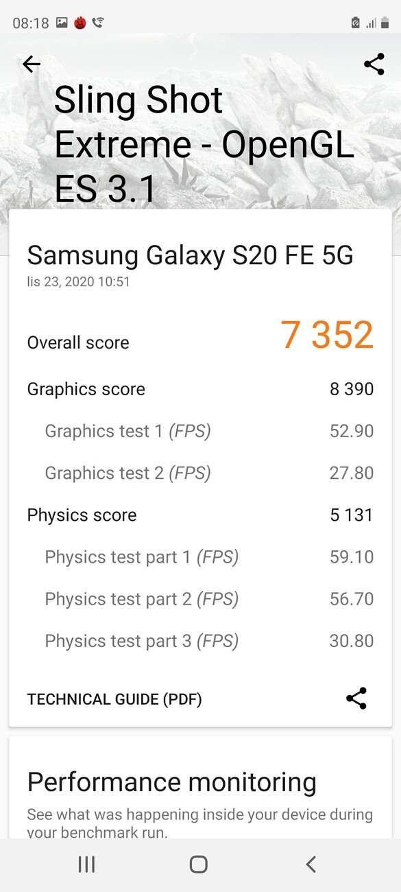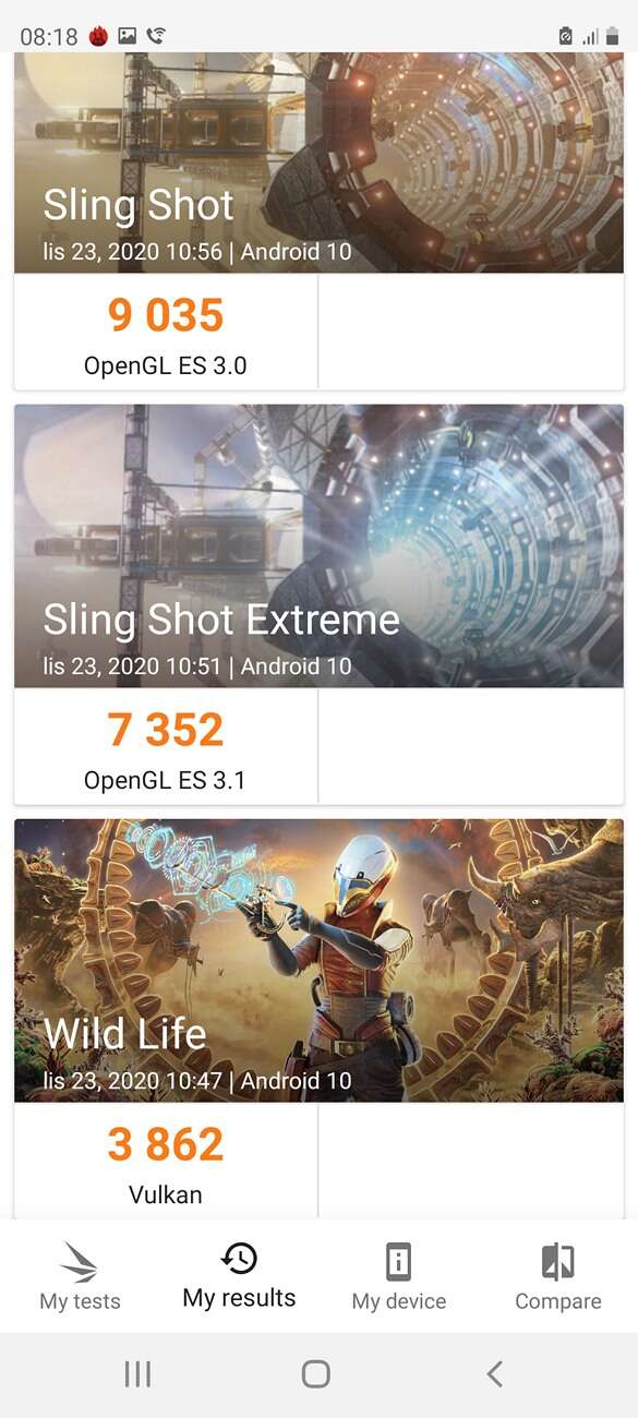 - 3D Mark (test Sling Shot Extreme) – 7352 pkt (OpenGL ES 3.1)