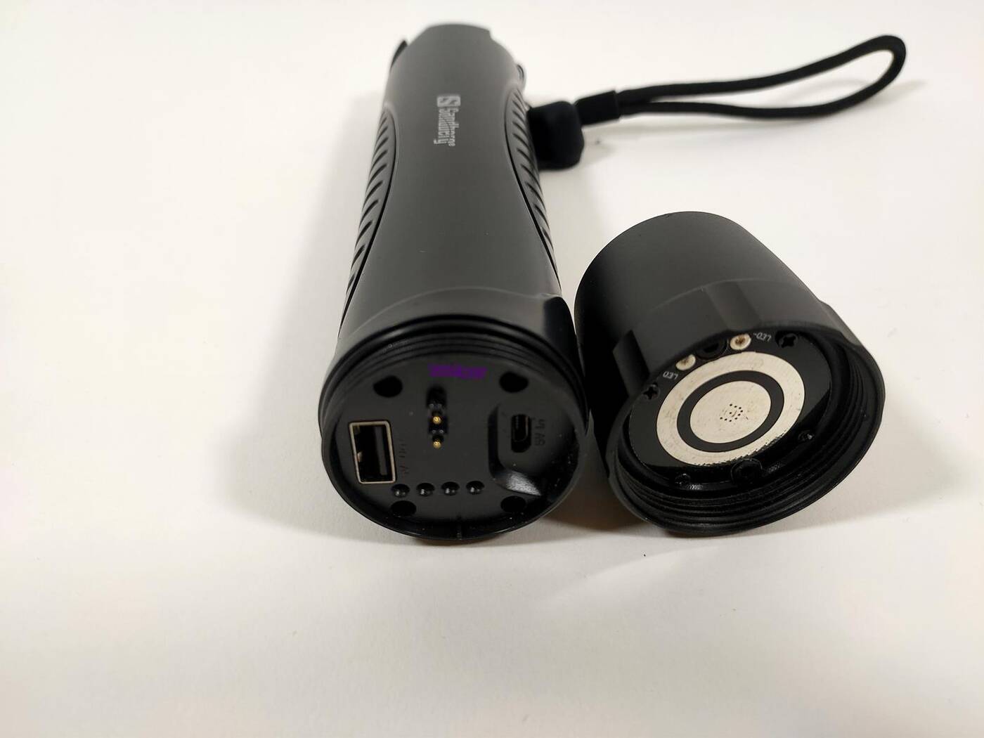 Przednia część jest odkręcana. Pod nią znajduje się wejście micro USB 5V/1A oraz wyjście USB 5V/2A. Można więc ładować tylko jedno urządzenie w danym momencie. Czas ładowanie powerbanku to 8 godzin. Sandberg Survivor Torch Powerbank 10400 ma certyfikat IP68, czyli jest odporny na wodę i kurz. Obudowa jest także odporna na uderzenia.
