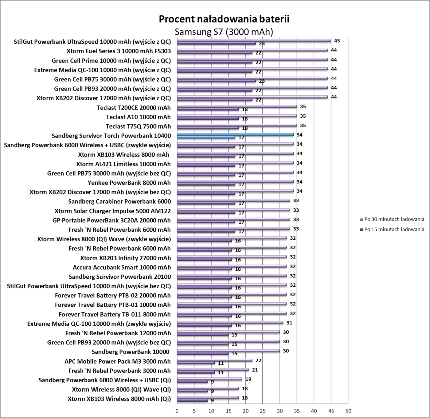 W testach wykorzystano smartfon Samsung Galaxy S7. Ponieważ większość osób ładuje włączone telefony z uruchomionymi niektórymi funkcjami, zdecydowałem się na ładowanie smartfonu z wyłączonymi aplikacjami, ale z włączonymi takimi funkcjami jak Bluetooth, NFC, Always on Display czy lokalizacja. Dzięki temu dostajemy informację o tym, jak powerbank będzie w stanie naładować działający smartfon.