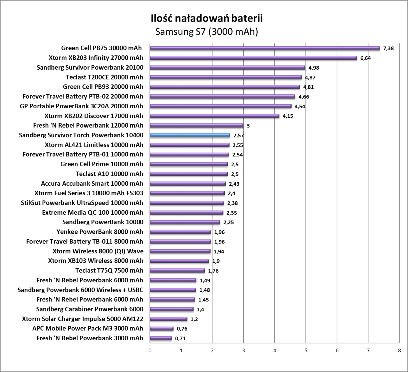 Wyniki testów są bardzo dobre. Powerbank szybko ładuje smartfon, choć brakuje mu Quick Charge. Stosunek naładowań do pojemności również jest znakomity – jeden z lepszych powerbanków po tym względem. Latarka świeci dosyć mocno i spokojnie pozwoli na oświetlenie miejsca rozbicia namiotu, pomieszczeń w nocy czy trasy, którą idziecie.