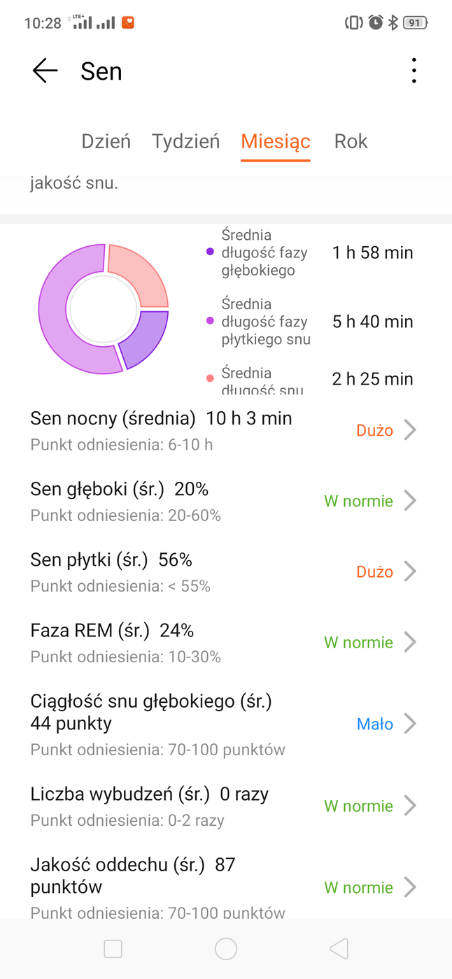 W głównym oknie możecie zobaczyć podstawowe informacje. Można przeglądać je w skali dziennej, tygodniowej, miesięcznej lub rocznej. Całość jest przejrzyście pokazana, choć przeskakiwanie pomiędzy dniami mogłoby być łatwiejsza. Ogromną zaletą jest automatyczne śledzenie snu. Nie trzeba nic włączać, Honor Watch Magic samodzielnie wykrywa zaśnięcie. Pokazana analiza snu jest bardzo dokładna i możemy wiele z niej się dowiedzieć. Jest to jedna z lepszych analiz snu, jakie widziałem w tego typu urządzeniach.