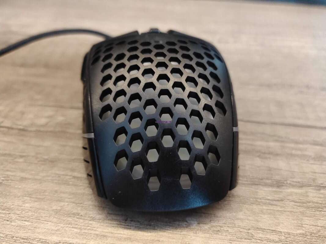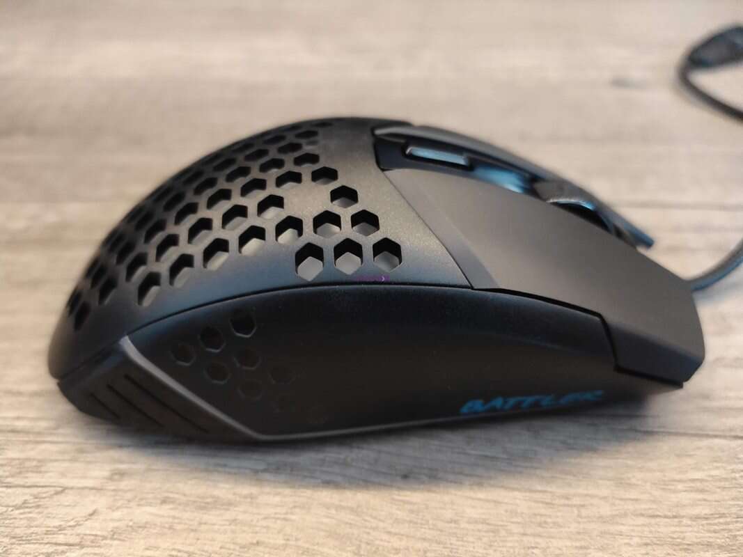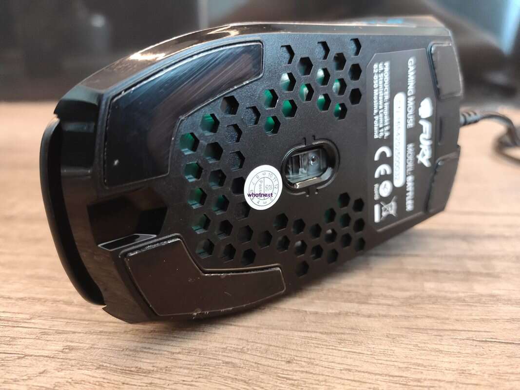 Ostatnio na rynku myszek możemy zauważyć dziwny trend tego właśnie typu obudów, czyli z wieloma wytłoczeniami zwłaszcza na grzbiecie, co nie tylko eksponuje podświetlenie, ale też obniża znacząco wagę. Fury w swoim modelu Battler z pewnością obrało z tym dobry kierunek, stawiając na dosyć gęsto upakowane, małe sześciokąty tylko i wyłącznie na grzbiecie. Pod nim znajduje się podświetlana sekcja z panelu mlecznego, która rozświetla znaczną część myszki, jak również jej boki w ramach czterech wcięć.