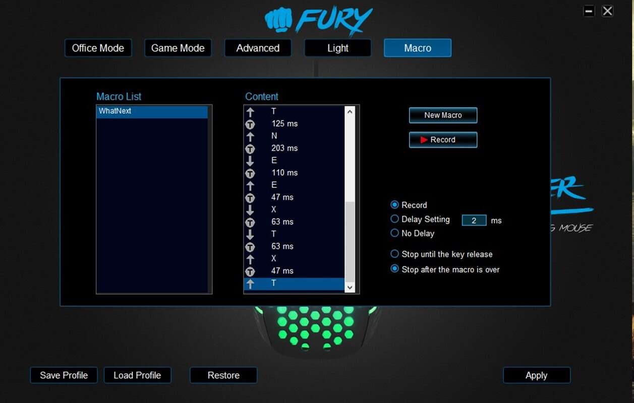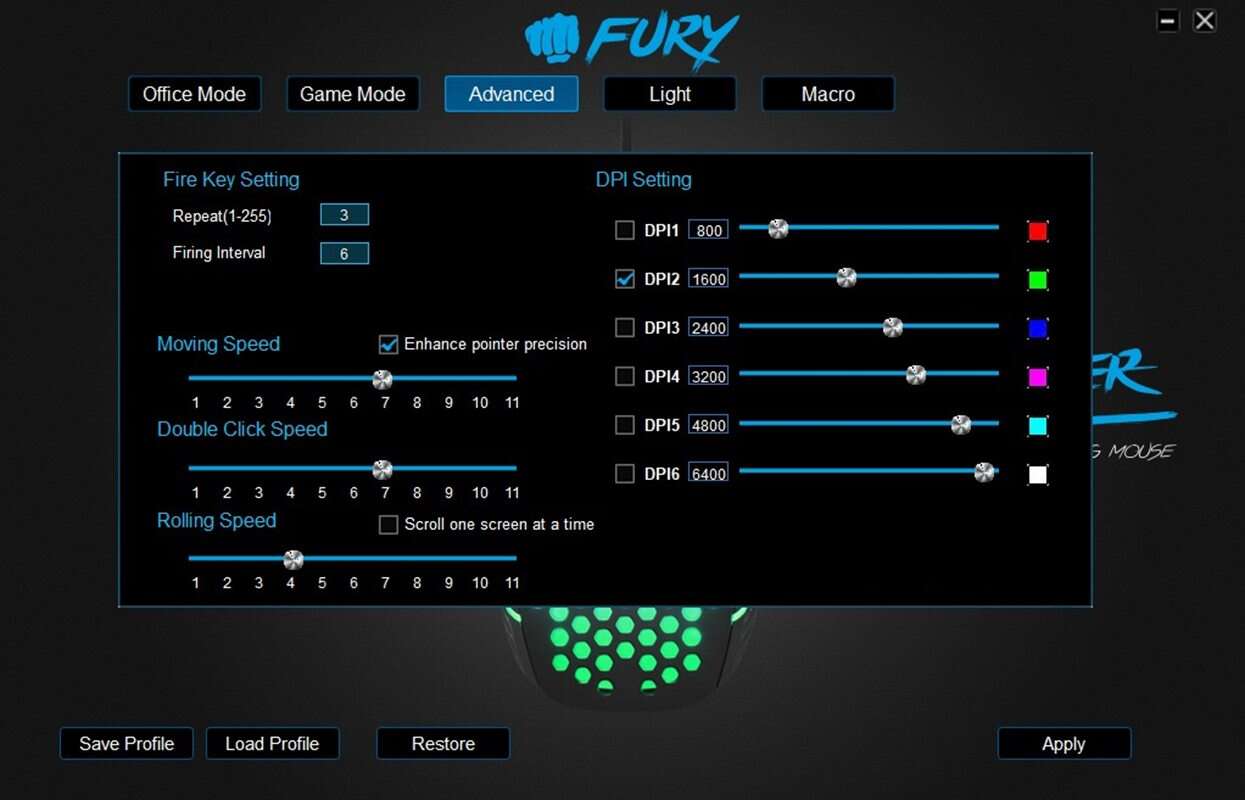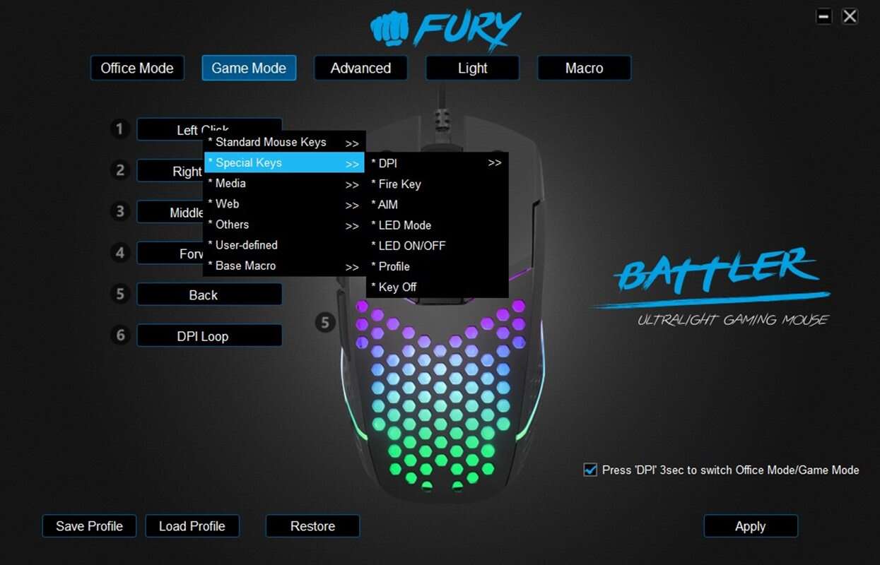 Dostępna tutaj do pobrania aplikacja nie sprawia jakiegoś ekstra wrażenia, ale jest i w tej cenie należy to docenić. Zwłaszcza że ma w sobie kilka bajerów, jak np. dwa tryby przypisań (tryb do biura i do gier), między którymi możemy przełączać się po naciśnięciu przycisku zmiany DPI przez dłuższy czas oraz możliwość przypisania Fire Key, którego w menu Advanced możemy skonfigurować pod kątem powtórzeń i tego, ile aktywacja ma trwać. Innymi słowy, to taki programowy “automat do klikania LPM”, dzięki któemu możemy np. ustawić sobie potrójny burst w karabinie.