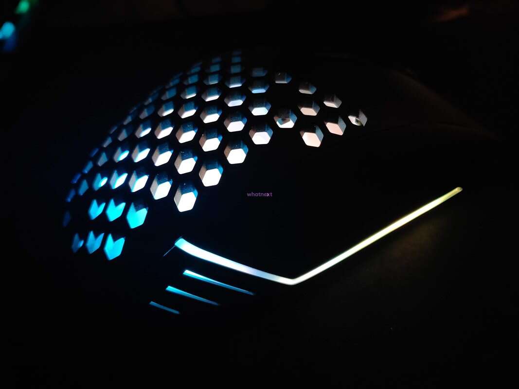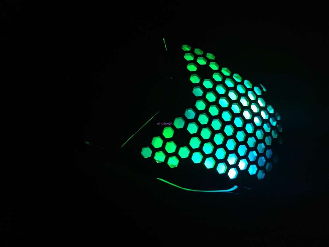 Wbrew pozorom, to nie jest wcale tak okropne, jak cena mogłaby sugerować. Ciekawy efekt uzyskany przez podziurawioną obudowę może się podobać, jak również rozstawione paski po bokach wypełnione mlecznymi wstawkami. Diody ponadto rozświetlają całość równomiernie i mogą to robić w łącznie pięciu powszechnych trybach.