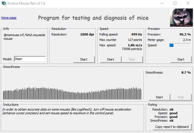 Jak wykazał nasz test, A3050 w modelu Disan wcale nie różni się od jego typowych implementacji. Częstotliwość jego odświeżania jest jednak przyzwoita, wahając się okazjonalnie przy 1000 Hz, a test w Enotus wykazał dobrą prędkość maksymalną, precyzję i racjonalny smoothing.