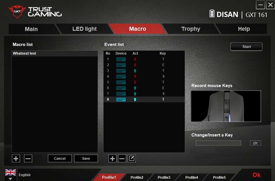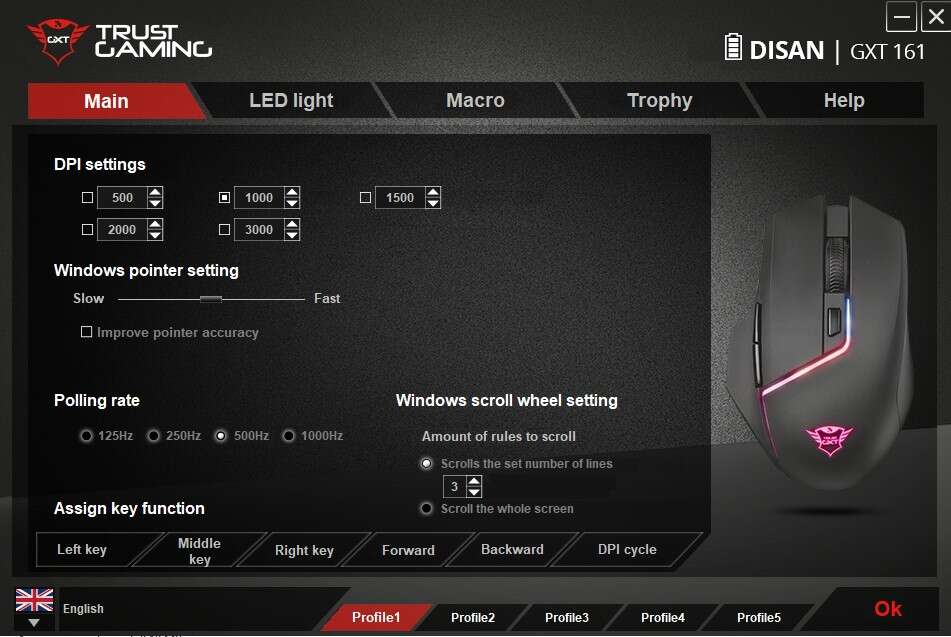 Dostępna do pobrania aplikacja GXT 161 Gaming Mouse korzysta z tradycyjnych rozwiązań dla Trusta. Dzieli się na pięć zakładek, z czego najbardziej interesują nas pierwsze trzy, gdzie dostosujemy pięć poziomów czułości, ustawimy częstotliwość odświeżania, przypiszemy nowe funkcje do klawiszy, pobawimy się podświetleniem, czy tworzeniem makr.