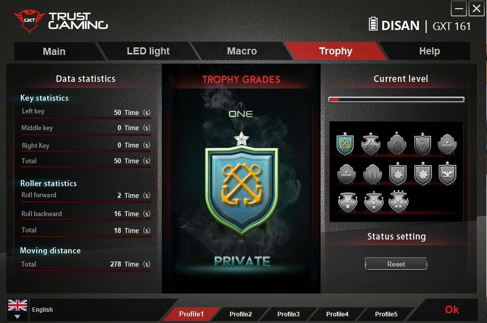 Zakładka Trophy, to już czysta zabawa dla… sam nie wiem kogo w zdobywanie coraz to wyższych odznak poprzez samo korzystanie z myszy. Problem? Nie wiem dlaczego, ale od czasu do czasu postęp zwyczajnie mi się resetował resetował się, Piątka zakładka z kolei pozwala nam na sprawdzenie aktualizacji, odwiedzenie społecznościowych profili marki, reset ustawień do domyślnych oraz zabawę w importowanie i eksportowanie do pięciu profili.