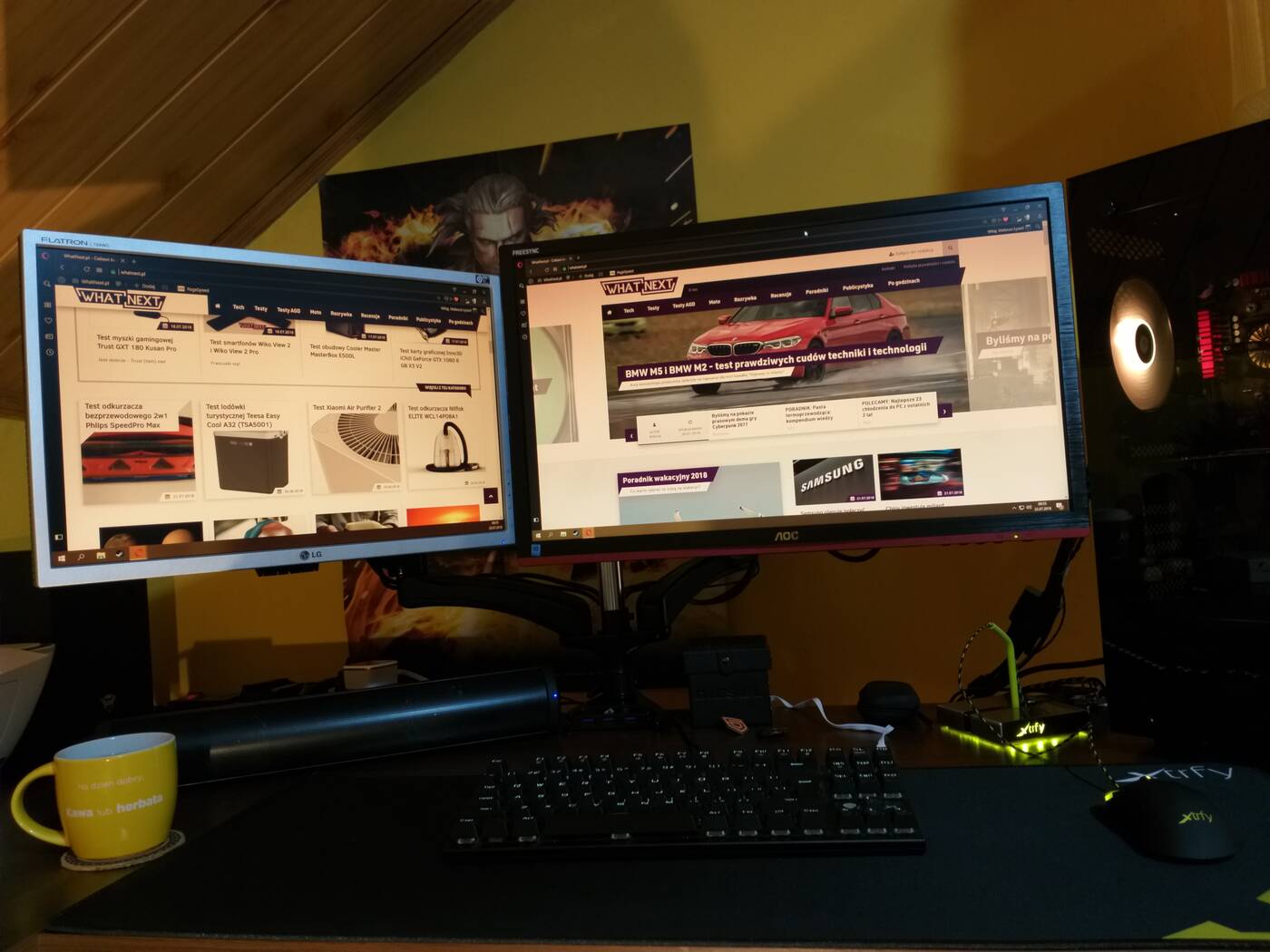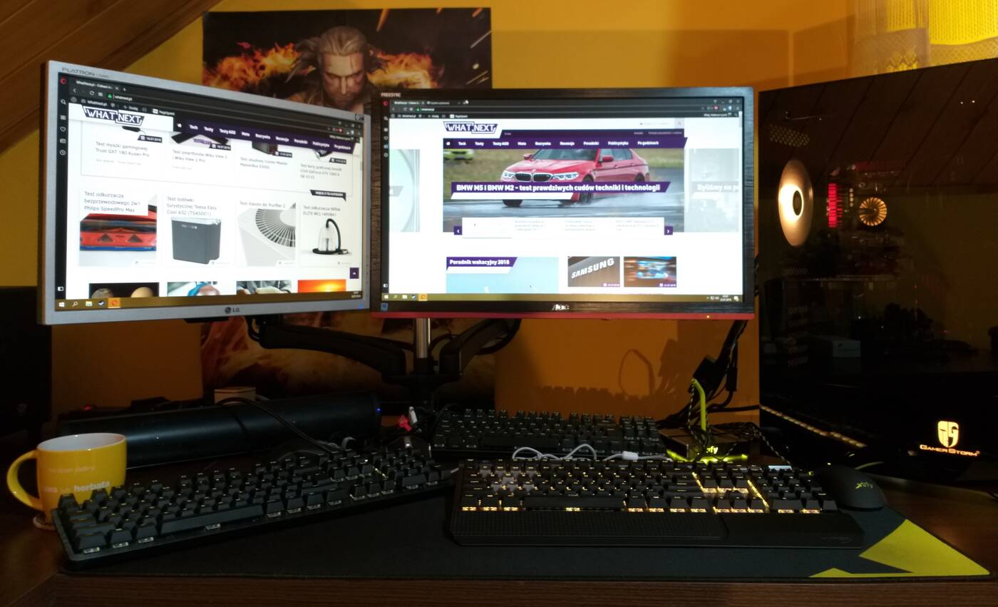 Zacznę może od samego początku, czyli składania Z2-3D. Wyjęcie wszystkiego z pudła, rzut okiem na instrukcję, montaż ramienia i ostateczne osadzenie wraz z monitorami na biurku zajął mi prawie godzinę. Nie była to jednak godzina prosta, bo w jej ramach musiałem w pojedynkę osadzić główny element Z2-3D na zamontowanej wcześniej na blacie podstawie. Jednak po tym przygoda dopiero się rozpoczęła, bo nadszedł czas na regulację, która w kombinacji jednego 24-calowego monitora z pobocznych, 19-calowym, który pamięta czasy górowania CS 1.6, wymagała odrobiny wprawy. Jednak po kolejnych 30 minutach pozbyłem się nieregularności, dokręciłem wszystkie śrubki stabilizujące… zostawiając jedynie jedną połowicznie dokręconą. Następne 30 minut zajęło mi ogarnięcie przewodów i doprowadzenie ich przez zmyślne otwory do złączy na monitorze, ale liczę w tym również pospinanie również innych. Czego oczy nie widzą, temu sercu nie żal, więc nie miałem skrupułów z wykorzystaniem powstałej na mocowaniu podstawy ramienia luki, gdzie włożyłem całą wiązkę przewodów. Wynik? Żaden z nich nie zwisa mi teraz pod nogami.