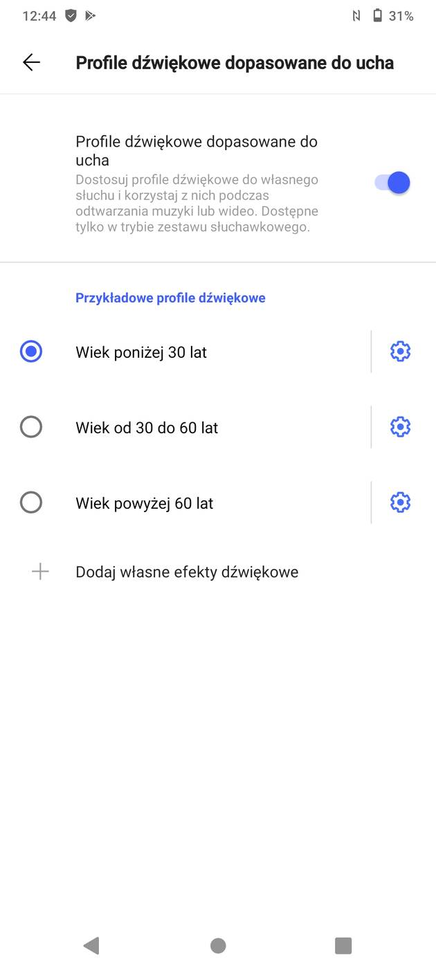 Po podłączeniu słuchawek pod gniazdo miniJack sytuacja się poprawia, ale do ideału daleko. Dźwięk jest co prawda zrównoważony tonalnie, ale mało przestrzenny. W ustawieniach nie znajdziemy klasycznego equalizera, ale możemy dopasować profile dźwiękowe do naszego ucha w zależności od wieku. Sprowadza się to głównie do manipulacji niższymi tonami.