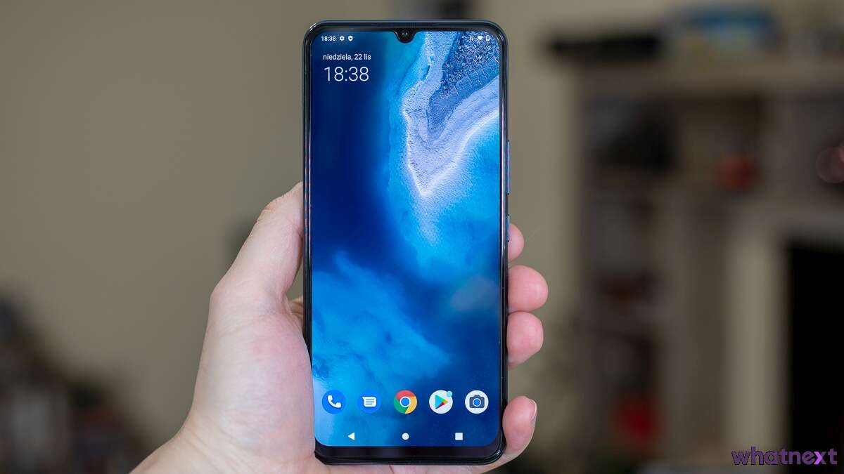 Z przodu mamy do czynienia z klasycznym, „bezramkowym” ekranem z łezką na przedni aparat pośrodku górnej krawędzi. A że w tym „bezramkowcu” ramki są widoczne, to front wygląda jak z klasycznego smartfona ze średniej półki, ale… A.D 2019. Producent szkła hartowanego położonego na froncie, niestety jest nieznany.