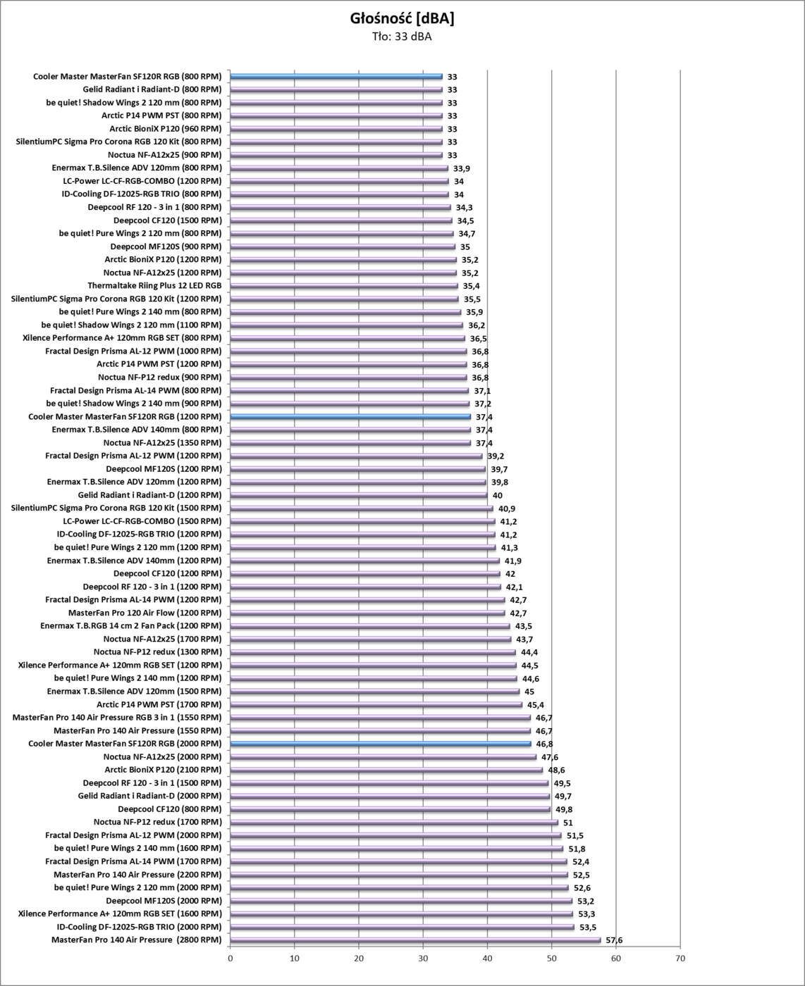 Na maksymalnych obrotach testowany wentylator jest w czołówce. Jednakże wraz ze spadkiem obrotów wydajność znacznie maleje – na 800 RPM to nawet najsłabszy wentylator w zestawieniu. Zobaczcie jednak co się dzieje z głośnością – za każdym razem jest ona świetna. Nawet na 2000 RPM Cooler Master MasterFan SF120R RGB nie jest odkurzaczem i spokojnie może działać. Na 1200 RPM jest już prawie idealna cisza.