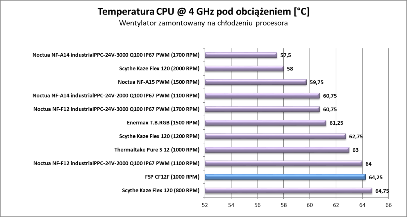 Wentylator w testach wypada poprawnie. Zdecydowanie jest on przeznaczony do obudowy, bowiem wyniki na chłodzeniu procesora są znacznie słabsze. Zresztą producent sam deklaruje, że jest to „case fan” więc takie wyniki nie dziwią. Wentylator jest cichy w działaniu – praktycznie nie powinniście go słyszeć.