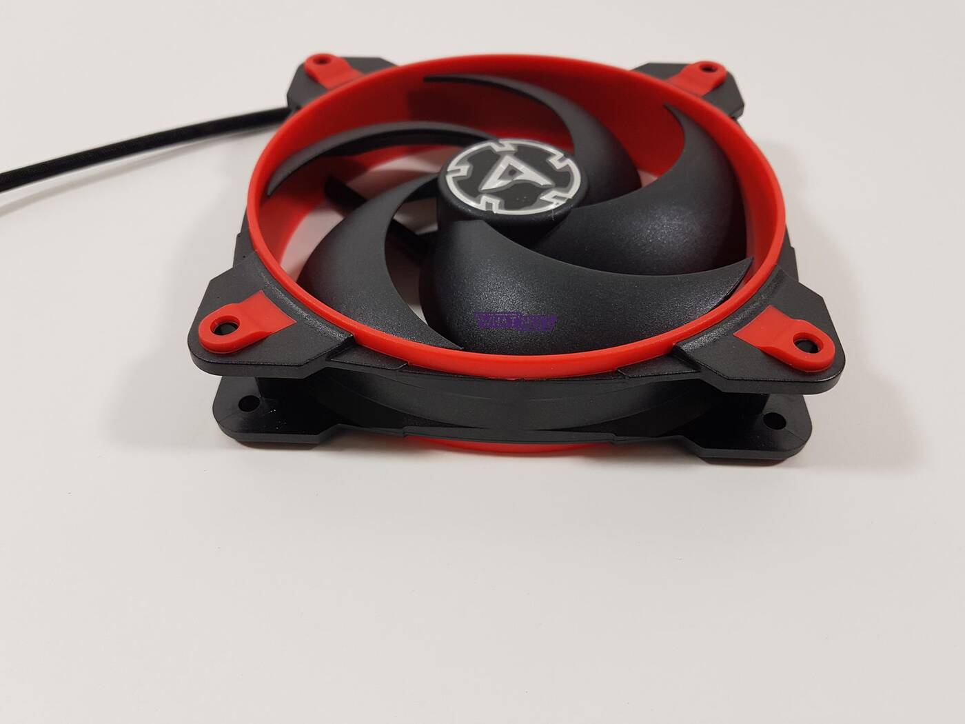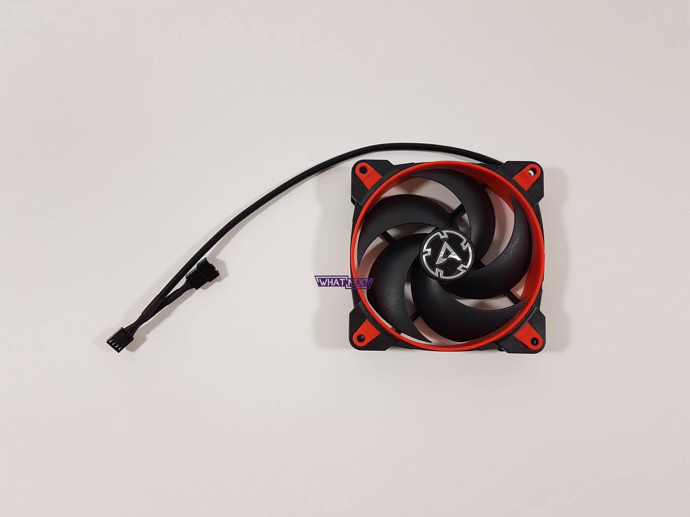 Śmigło wygląda tak samo, jak te z poprzedniej serii BioniX. Otrzymałem wersję czerwoną, ale na rynku znajdziecie też śmigło w kolorze białym. Posiada ono 5 skrzydełek, które są specjalnie zagięte w celu wytwarzania wysokiego ciśnienia i lepszego naprowadzenia powietrza na radiator. Wentylator ma typowe rozmiary dla 120 mm konstrukcji. Maksymalna prędkość wynosi 2100 RPM, głośność 0,45 Sone, przepływ powietrza 67,56 CFM a ciśnienie 2,75 mm. Warto tutaj dodać, że poniżej 5% PWM wentylator zatrzymuje się i nie kręci. Na kablu znajduje się też wejście dla drugiego złącza 4 pin, dzięki czemu można więcej śmigieł podłączyć do jednego złącza na płycie głównej.
