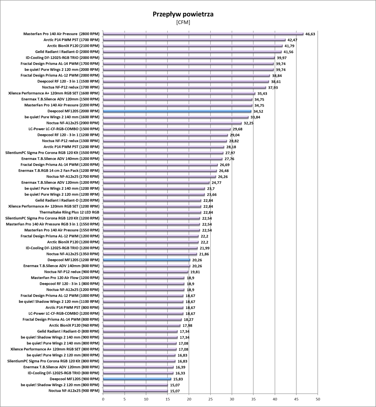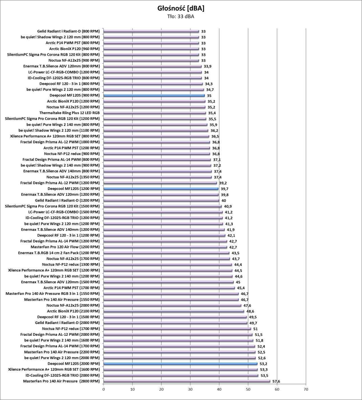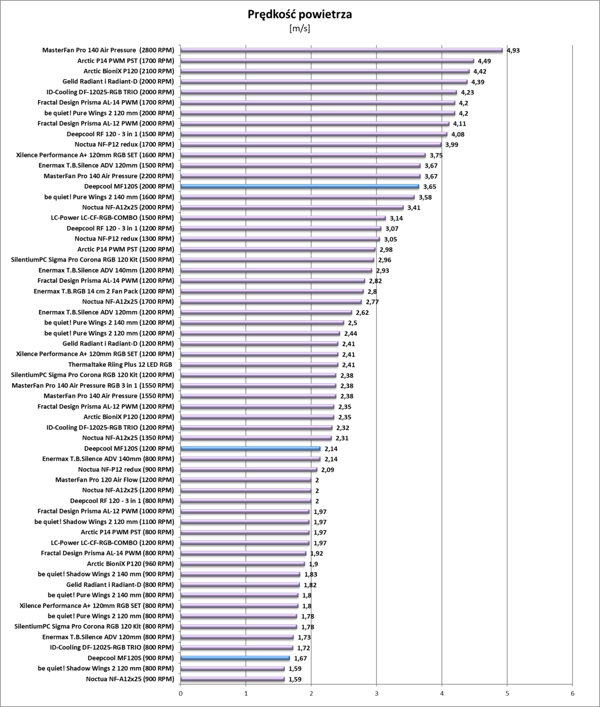 Wentylatory nie należą do najwydajniejszych. Uzyskane wyniki nie są złe, ale bardziej odpowiadają wentylatorom wytwarzającym duże ciśnienie. Można więc wnioskować, że śmigła lepiej sprawdzą się na chłodnicy niż w obudowie. Jednakże nawet w montażu w obudowie wentylatory zapewnią prawidłowy przepływ powietrza. Deepcool MF120S na maksymalnych obrotach są dosyć głośne, jednakże już na 1200 RPM jest cisza. Na 900 RPM (niżej nie udało mi się zejść) w ogóle nie powinniście słyszeć wentylatorów.