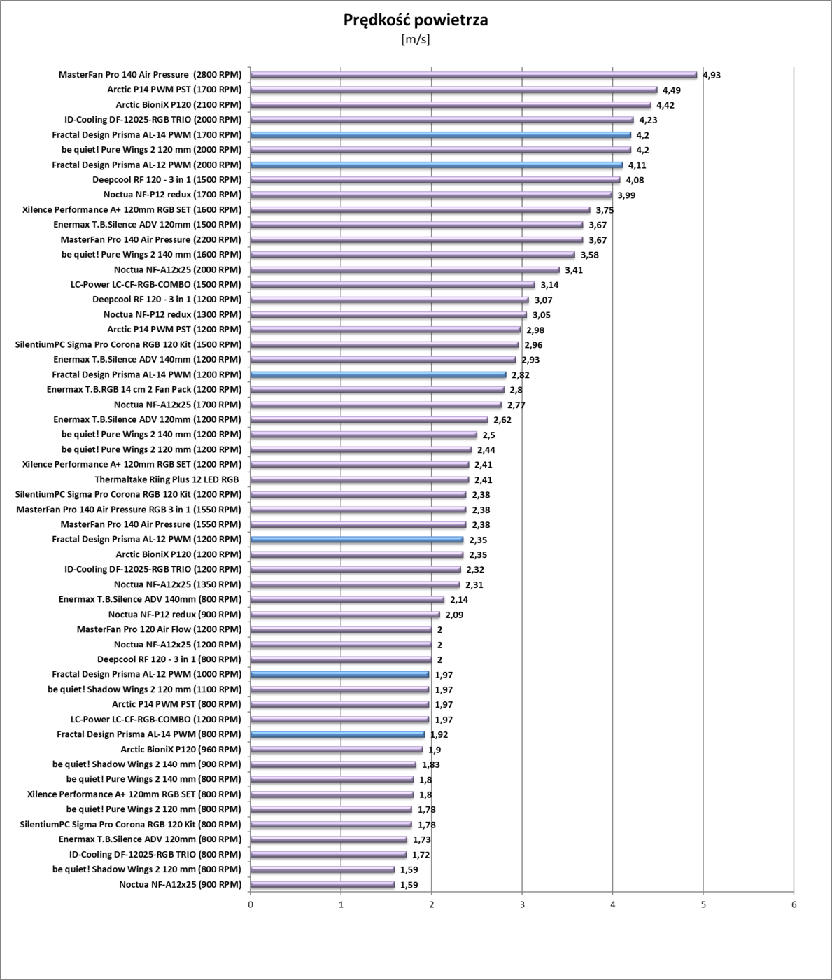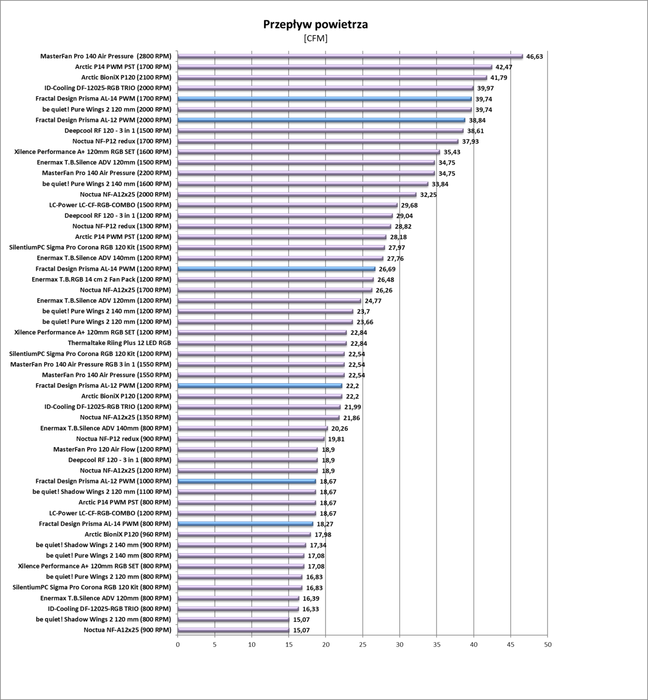 Oba śmigła są bardzo wydajne praktycznie na każdych obrotach. W szczególności ich maksymalne osiągi imponują – są naprawdę wysokie. Wentylatory zapewnią znakomity przepływ powietrza w obudowie. Są one niestety głośne na maksymalnych obrotach, ale od 1200 RPM robi się już całkiem cicho. Ponieważ śmigła mają PWM to wątpliwe jest, aby kiedykolwiek wskoczyły one na maksymalne obroty.