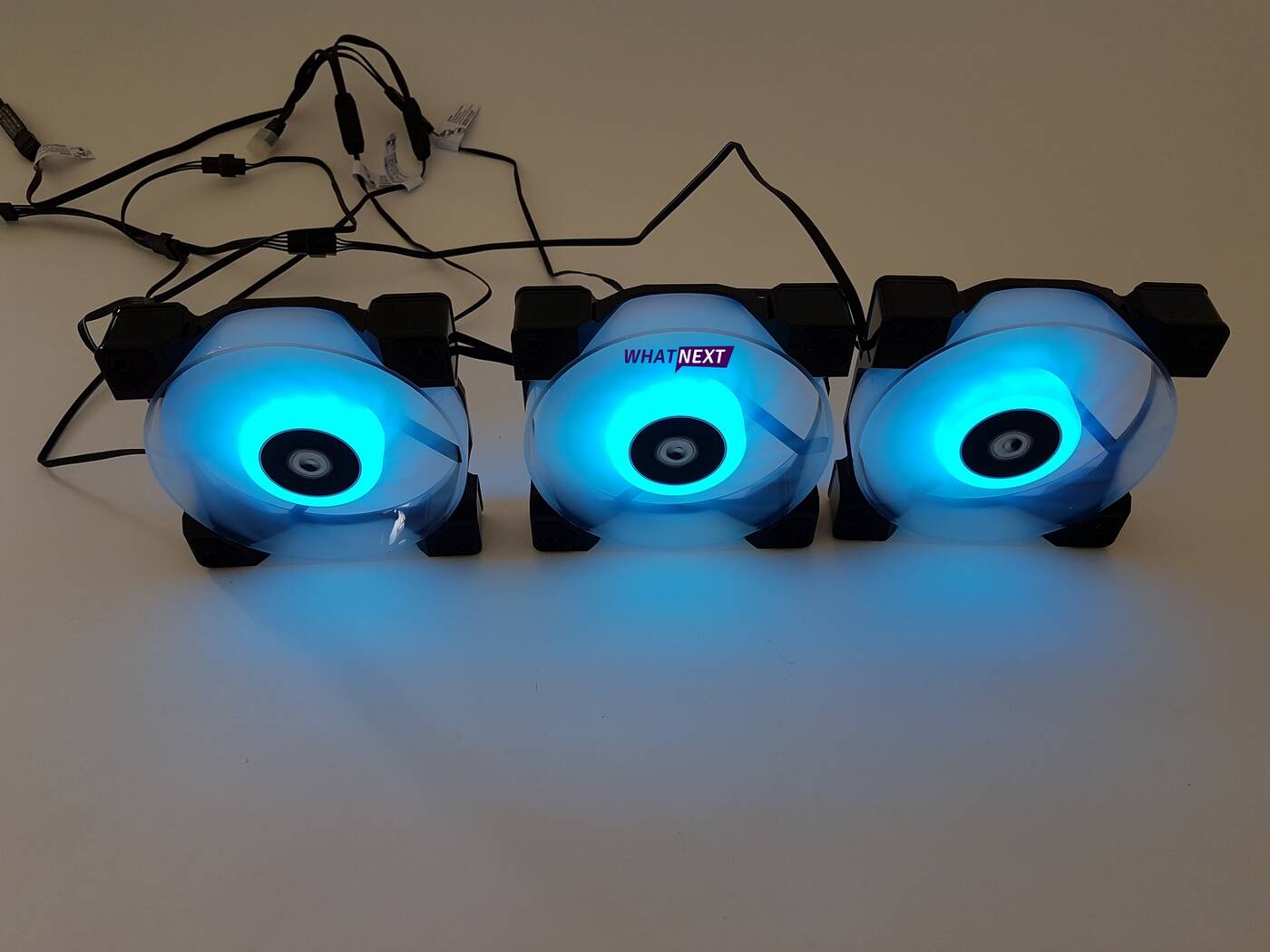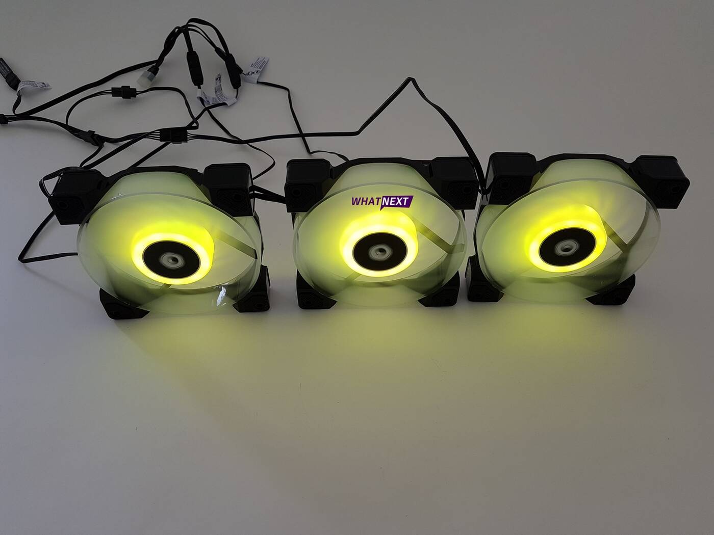 Wentylatory zostały zapakowane w czarno-pomarańczowy karton. Wraz z nimi otrzymujemy śrubki, mnóstwo kabli oraz pilot. Ten ostatni jest bardzo intuicyjny i pozwala na szybką i łatwą obsługę podświetlenia. Także komunikuje się on za pomocą fal radiowych wiec nie trzeba bawić się w czujniki podświetlenia – świetne rozwiązanie. Kable pozwalają na podłączenie wszystkich wentylatorów do jednego złącza 4 pin na płycie albo do kontrolera lub złącza RGB na płycie.
