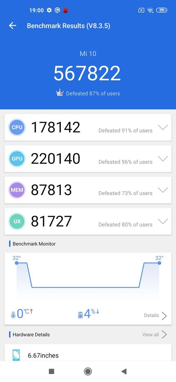 Na pokładzie Xiaomi Mi 10 znajdziemy najwydajniejszy układ amerykańskiej firmy Qualcomm – Snapdragon 865 wraz z grafiką Adreno 650 oraz 8 GB pamięci RAM. Wydajnościowo smartfon bije zdecydowaną większość urządzeń na rynku, w tym najnowsze smartfony Samsunga z serii Galaxy S20 oparte na Exynosie 990. Wyniki w benchmarkach prezentują się następująco: