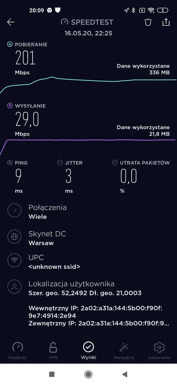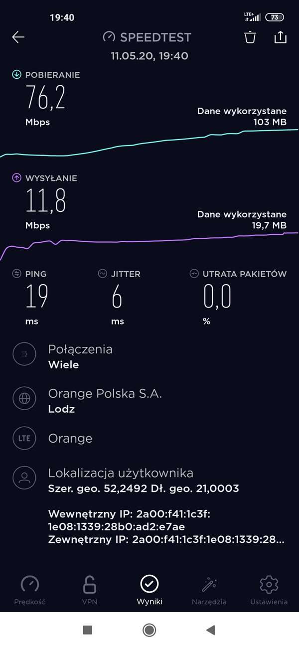 Xiaomi Mi 10 sprzedawany na polskim rynku obsługuje tylko jedną kartę nanoSIM i zero kart pamięci. Smartfon obsługuje sieć 5G, ale póki co w naszym kraju oferuje ją jedynie sieć Plus i to tylko w kilku miastach, dlatego klienci innych sieci (w tym ja) nie mają się czym ekscytować. Dla zdecydowanej większości konsumentów ważniejszą kwestią jest praca na Wi-Fi i LTE, a tu bywa równie. O ile Wi-Fi 6 (802.11 a/b/g/n/ac) przez cały okres trwania testów spisywało się bez zarzutu i oferowało niezłe prędkości przesyłu danych (UPC Warszawa: 201 Mb/s pobieranie oraz 29 Mb/s – wysyłanie danych) to w przypadku LTE tak różowo już nie było. Prędkość LTE w sieci Orange w Warszawie wyglądała następująco: 76,1 Mb/s pobieranie oraz 11,8 Mb/s w przypadku wysyłania danych. Słabo, jak na tą klasę sprzętu, a trzeba dodać, że jest to najlepszy wynik jaki osiągnąłem. Zrobiłem ok. 10 pomiarów w różnych dniach i godzinach (i to na dwóch kartach nanoSIM) i często wynik był nawet o połowę słabszy od najlepszego.