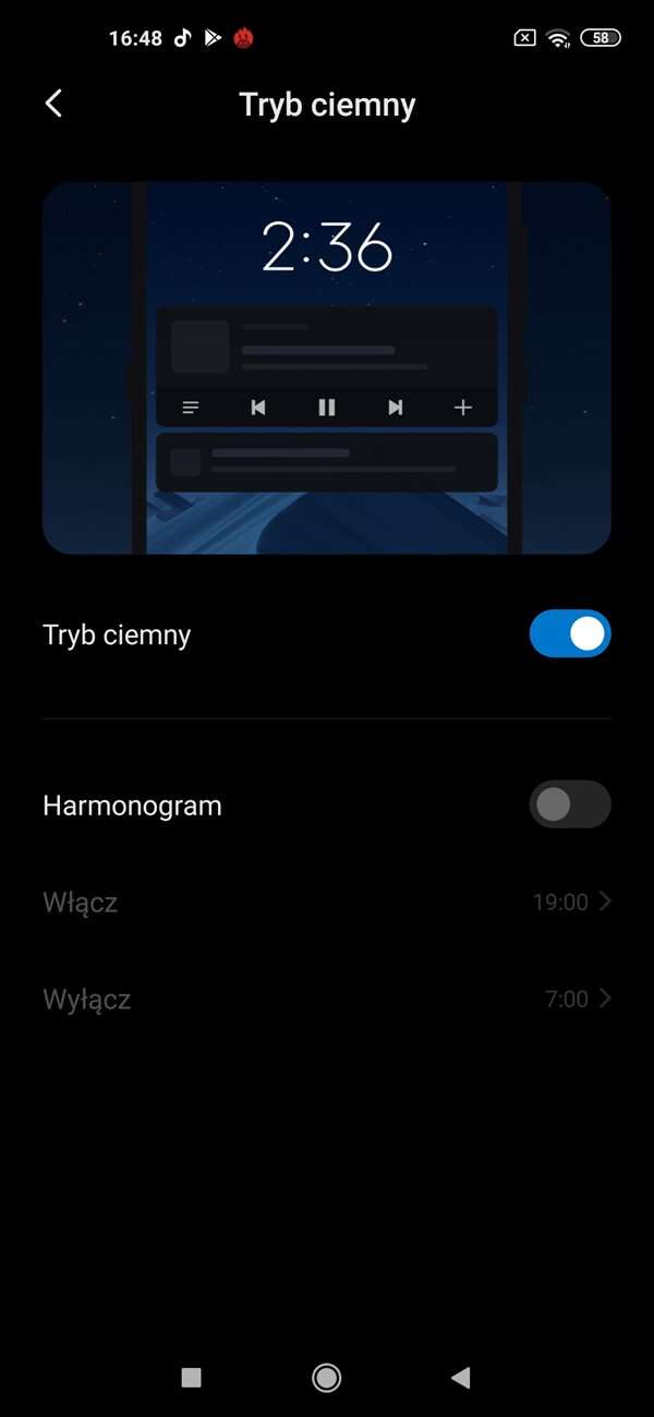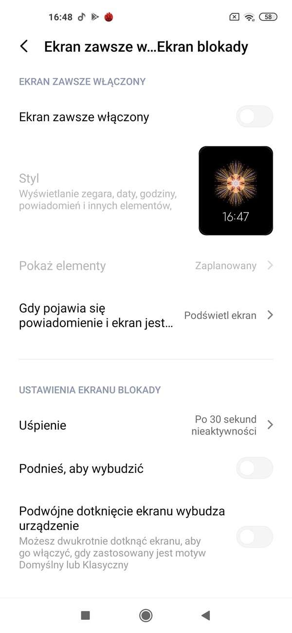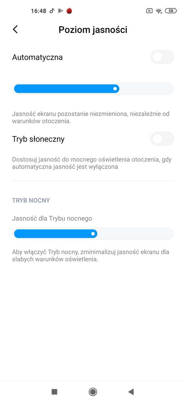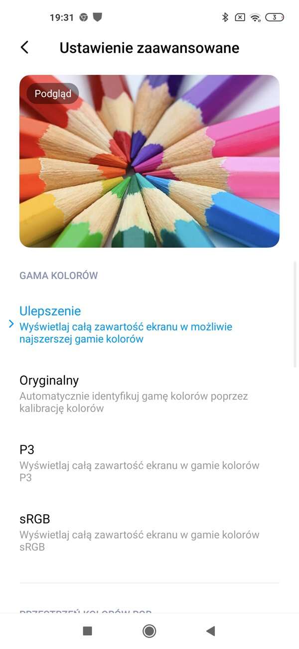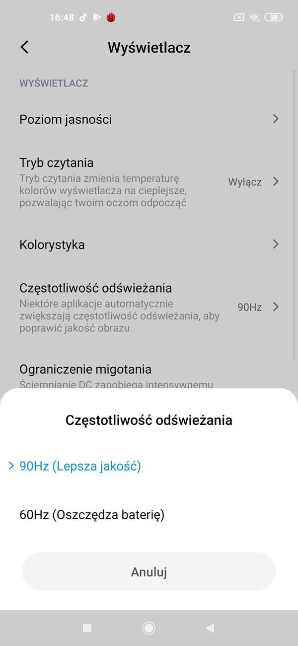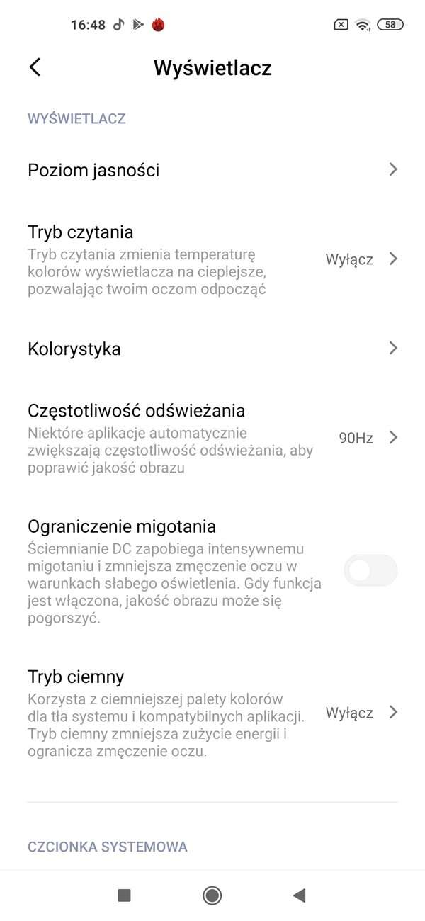 W ustawieniach możemy włączyć 60 Hz odświeżanie (w celu oszczędzania baterii), tryb ciemny dla menu oraz filtr światła niebieskiego (tryb czytania). Ponadto możemy regulować temperaturę barwową oraz ukryć wcięcie w ekranie (wyświetla się wtedy po jego bokach czarny pasek). Możemy również włączyć funkcję redukcji migotania ekranu, choć ja różnicy tu nie zauważyłem (poza minimalnym ściemnieniem wyświetlacza).
