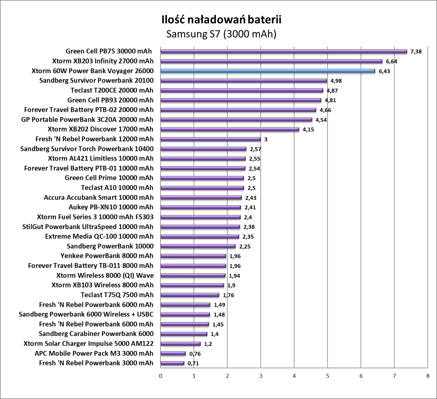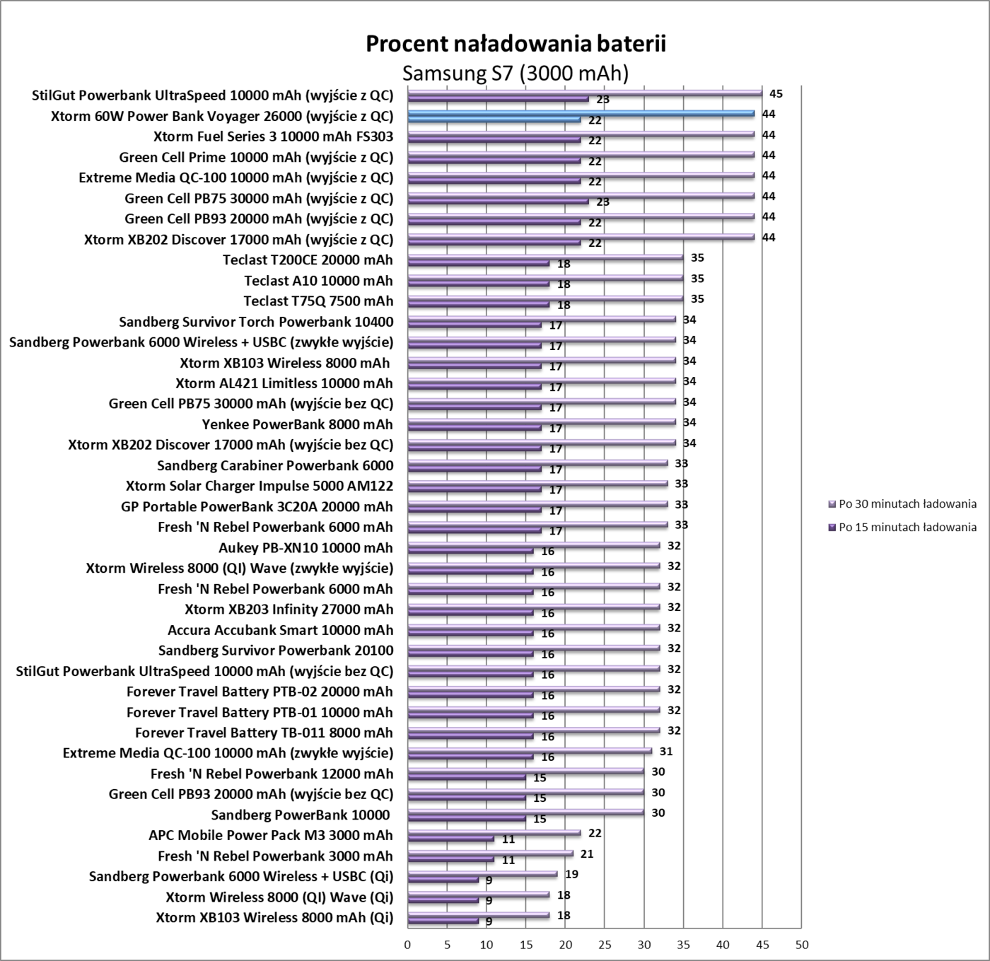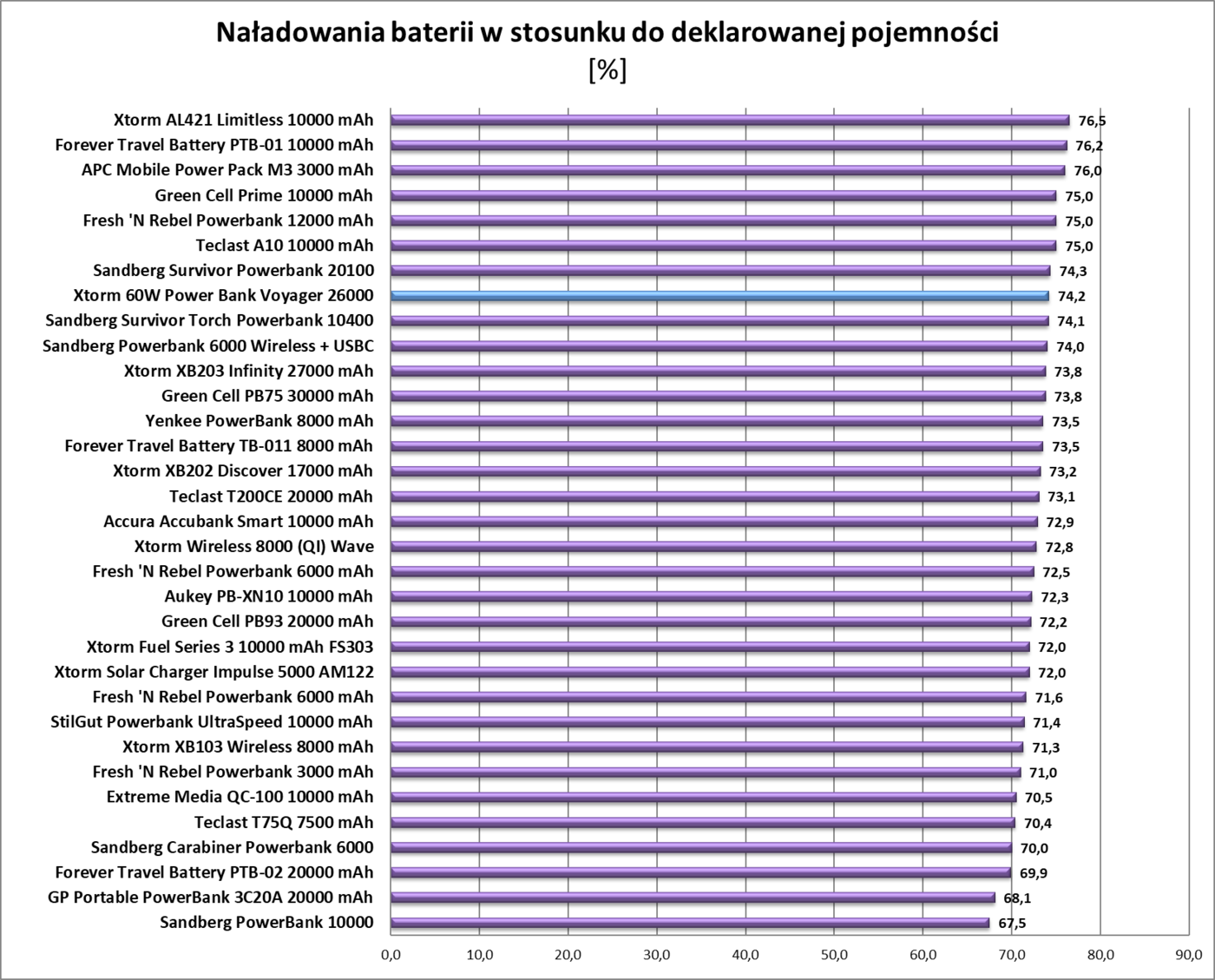 Wszystkie wyniki testów są bardzo dobre. Xtorm 60W Power Bank Voyager 26000 bardzo szybko ładuje smartfony oraz ma deklarowaną pojemność. Prędkości ładowania nie spadają też podczas ładowania kilku urządzeń w tym samym czasie. Nie mam jak sprawdzić wyjścia PD, ale mam ładowarkę PD. I rzeczywiście – szybki naładowanie powerbanku przy wykorzystaniu tej technologii jest jak najbardziej możliwe.