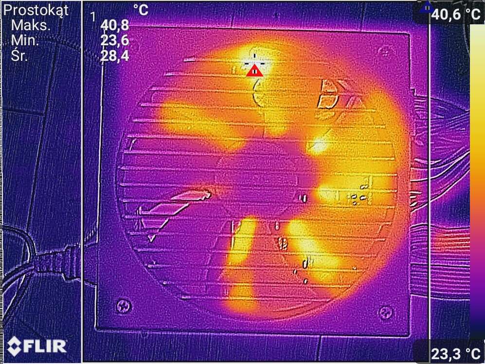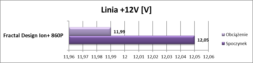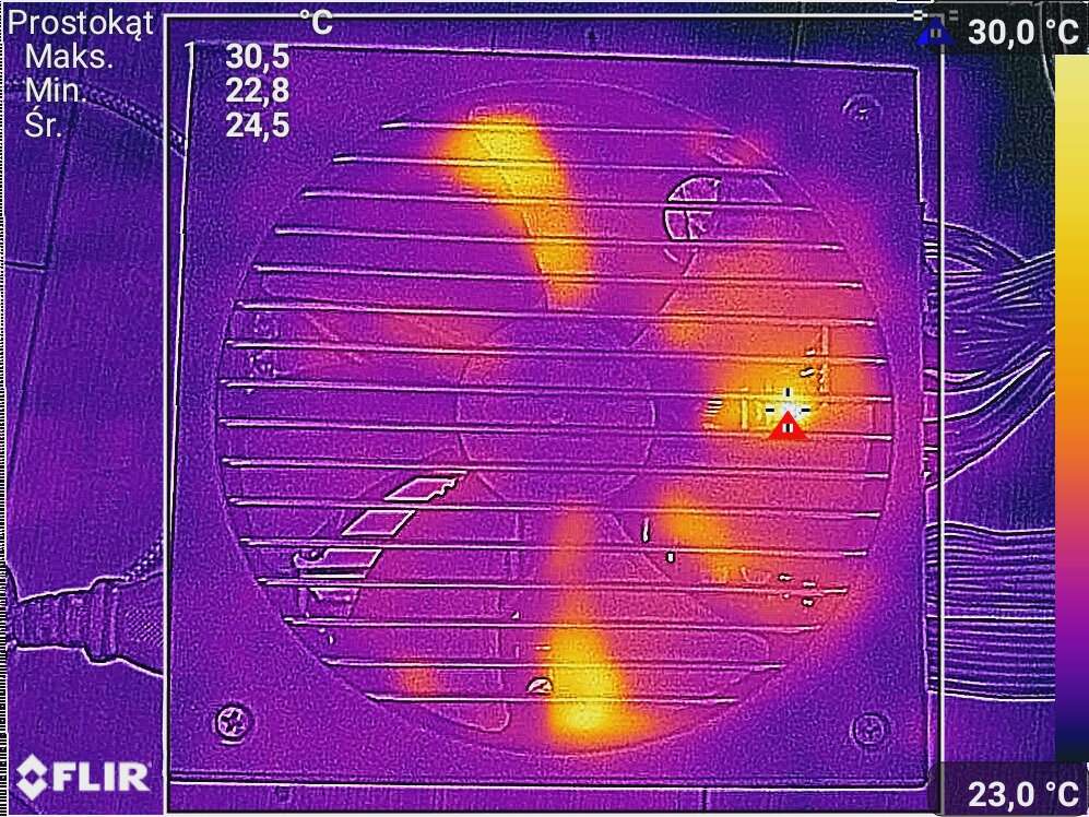 W testach temperatury wykorzystałem moduł termowizyjny smartfonu CAT S61. Napięcia, zarówno w spoczynku jak i pod obciążeniem, są znakomite. W szczególności linia +12 V pod obciążeniem jest praktycznie idealna. Testy przeprowadziłem z włączonym trybem ZeroRPM. Okazuje się, że wentylator pozostał w bezruchu nawet pod obciążeniem. Skutkowało to jednak zwiększeniem się temperatur w środku, choć idealna cisza jest tego warta. Fractal Design Ion+ 860P ma odznaczenia 80 Plus Platinum. Dla obciążenia 10% sprawność wynosi 89,02%, dla 20% – 92,41%, 50% – 92,62%, a dla 100% – 89,99%.