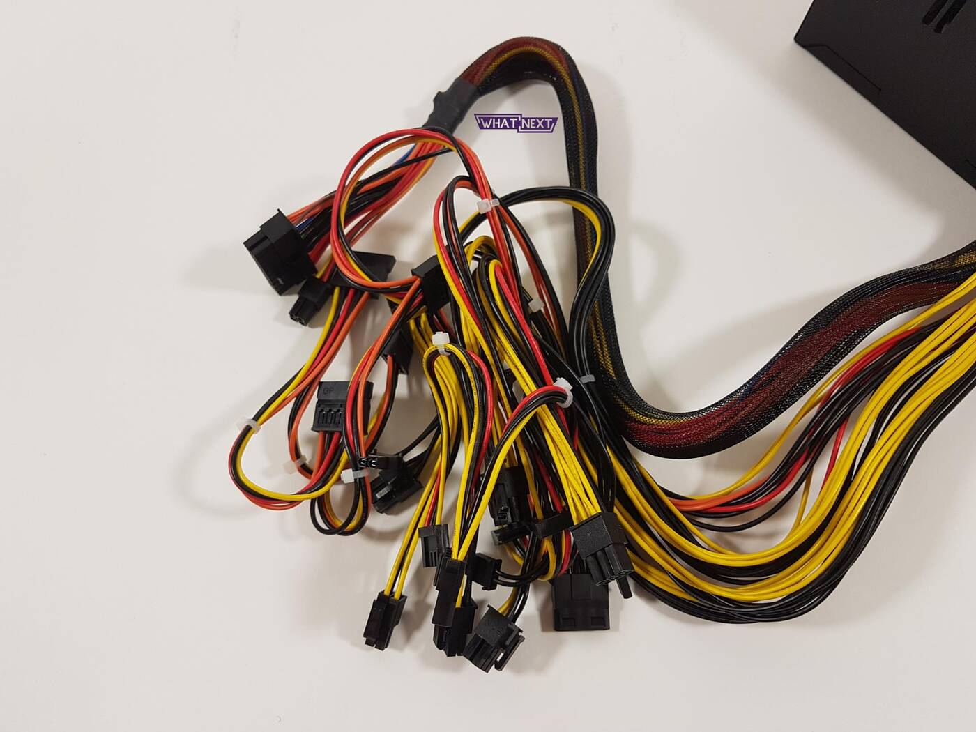 Okablowanie jest na stałe przytwierdzone do Hexa 85+ 650W – nie ma nic modularnego. Do dyspozycji jest jedna wiązka ATX 20+4 pin (550 mm), jedna CPU 4+4 pin (600 mm), dwie 2x PCI-E 6+2 pin (500 mm do pierwszej wtyczki, odległość pomiędzy kolejnymi wynosi 150 mm), jedna 4x Sata tradycyjne (500 mm do pierwszej wtyczki, odległość pomiędzy kolejnymi wynosi 150 mm), jedna 4x Sata kątowe (500 mm do pierwszej wtyczki, odległość pomiędzy kolejnymi wynosi 50 mm) oraz jedna 2x Moelx + FDD (500 mm do pierwszej wtyczki, odległość pomiędzy kolejnymi wynosi 150 mm). Mogła by być większa liczba złączy Molex, ale poza tym jest ok. Tak jak już wspominałem, prawie wszystkie wiązki nie mają oplotu – jedynie ATX ma. Jest to spory minus, który z pewnością nie spodoba się osobom posiadającym obudowę z oknem.