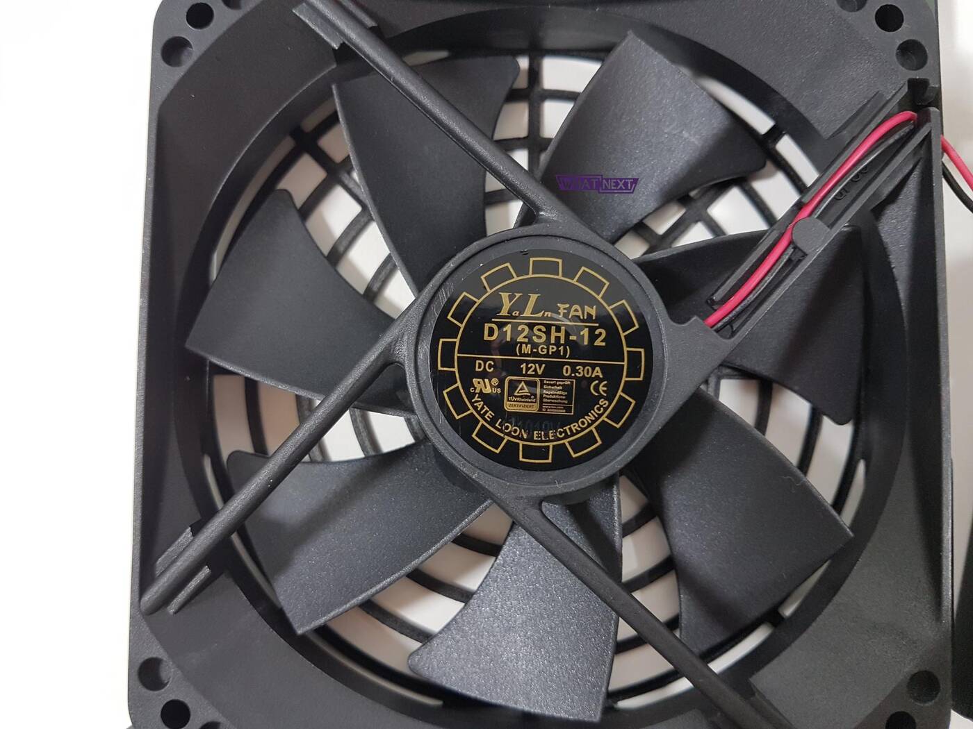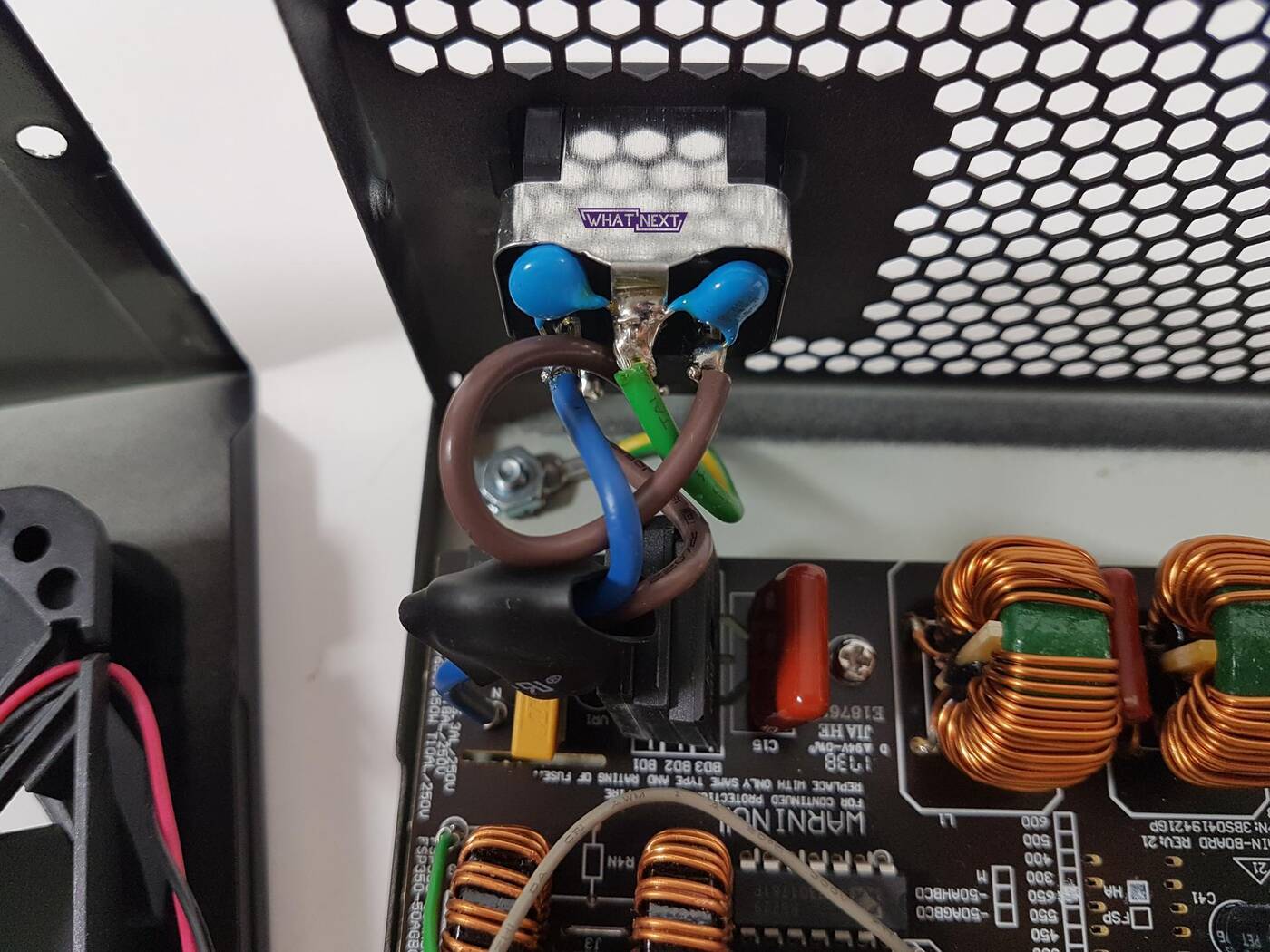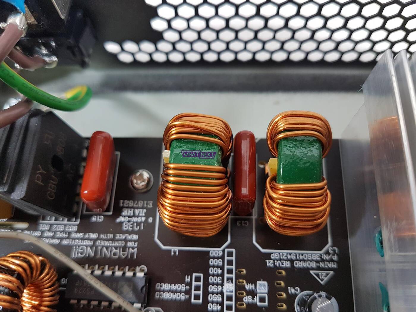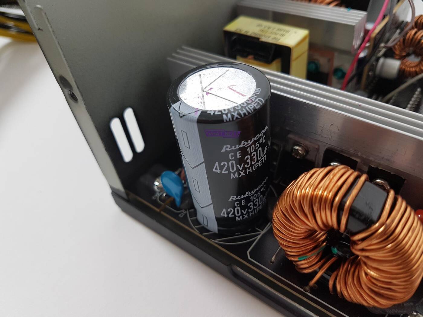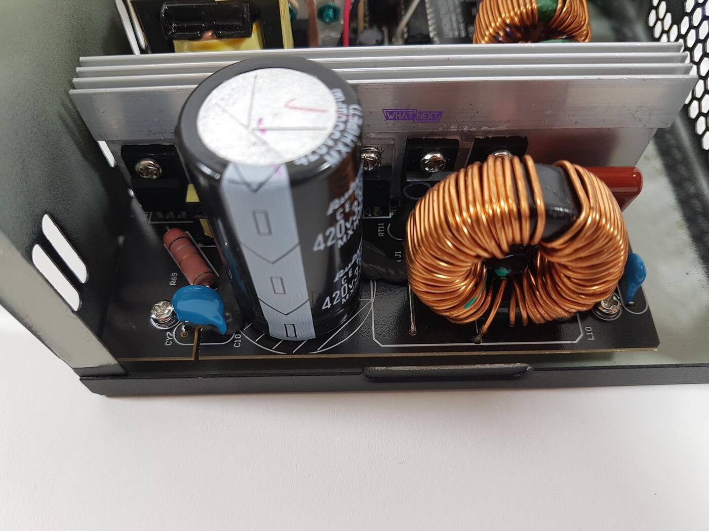 Za chłodzenie odpowiada 120 mm wentylator Yate Loon model D12SH-12. Posiada on 7 skrzydełek i powinien być stosunkowo cichy podczas działania – zobaczymy w testach. Środek wygląda na dosyć uporządkowany. Nie ma dziwnie przyklejonych elementów, klej nigdzie się nie wylewa a całość sprawia wrażenie bardzo przemyślanego. Największy kondensator ma parametry 420 V, 330 uF i może pracować w temperaturze do 105°C. Wyprodukował go Rubycon, czyli japoński producent elektroniki. Warto tutaj wspomnieć, że wszystkie kondensatory elektrolityczne są produkcji japońskiej. Zapewnia to wysoką jakość elektroniki i tym samym znacznie lepszą stabilność niż produkty konkurencji z kondensatorami wyprodukowanymi przez firmy z innych krajów.