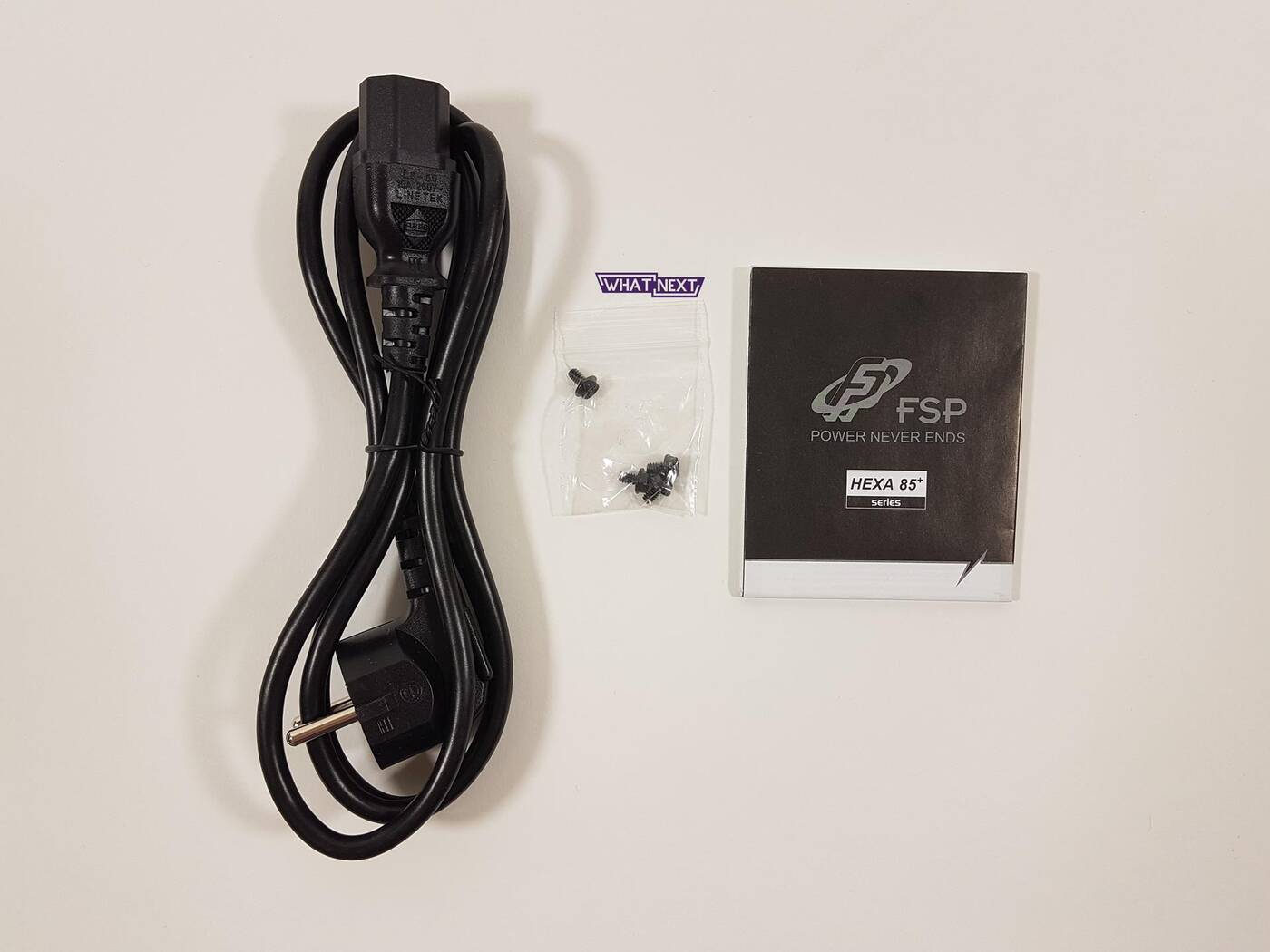 Zasilacz otrzymałem w brązowym opakowaniu, które od razu wskazuje na certyfikat 80 Plus Bronze. Wraz z Hexa 85+ 650W otrzymujemy kabel zasilający, śrubki oraz instrukcję. Brakuje mi minimalnej ilości opasek zaciskowych, ale nie jest to jakaś w szczególności ważna wada. Gwarancja wynosi 5 lat.
