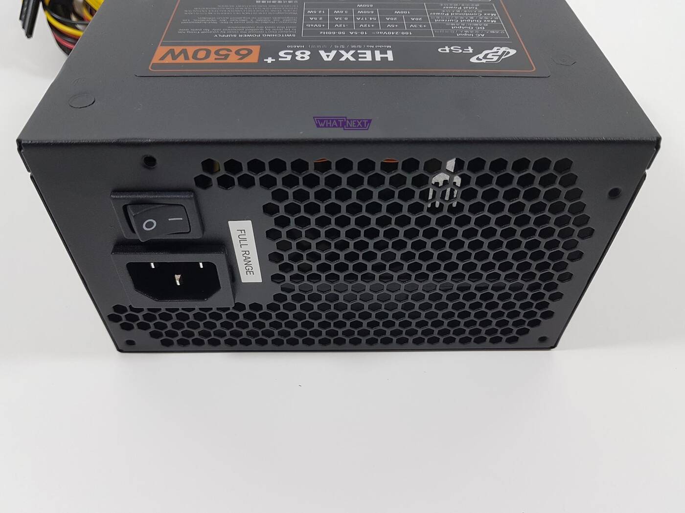 Tył zasilacza to klasyczny plaster miodu. Znajduje się tam także wejście zasilające (100-240 Vac i 50-60 Hz) oraz włącznik. Na spodzie producent umieścił tabliczkę znamionową. Do dyspozycji jest jedna linia +12V o prądzie 54,17 A i mocy 650 W. Linie +5V i + 3,3V można obciążyć po 20 A, łącznie 100 W. Łączna moc zasilacza to 650 W.