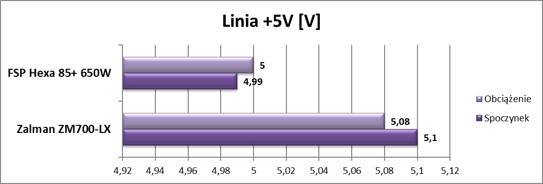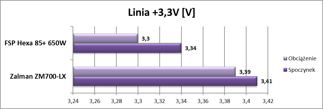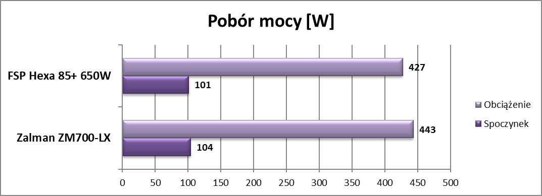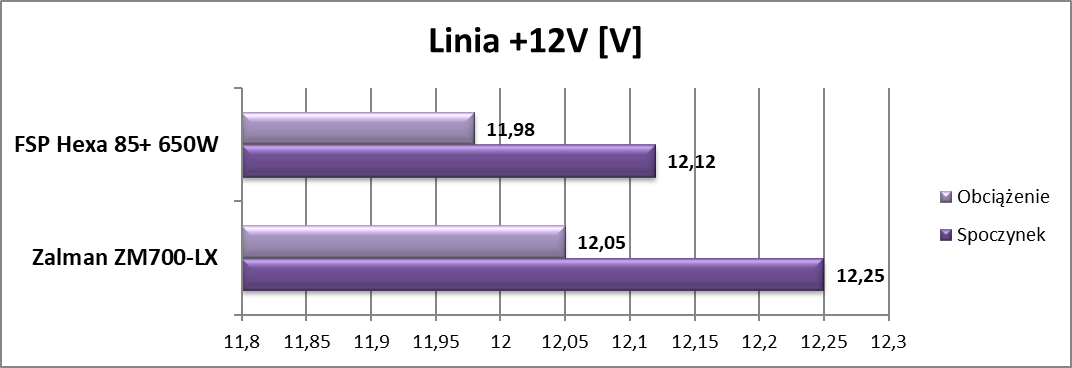 Wyniki testów napięć są znakomite. Zarówno pod obciążeniem, jak i w spoczynku zasilacz wypada świetnie co pokazuje, że zastosowana elektronika rzeczywiście jest wysokiej jakości. FSP Hexa 85+ 650W jest cichy w spoczynku, ale pod obciążeniem jest już trochę gorzej – można go usłyszeć. Tak jak już wcześniej wspomniałem, zasilacz posiada certyfikat 80 Plus Bronze. Dla obciążenia 10% sprawność wynosi 78,22%, dla 20% – 86,28%, 50% – 87,75%, a dla 100% – 84,61%.