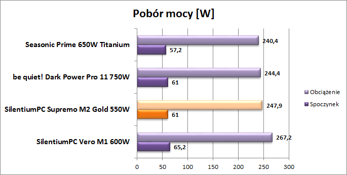 Kolejna z propozycji SilentiumPC dobrze prezentuje się pod względem napięć. Jedynie te na linii +3,3V mogły by być mniejsze oraz mógłby być mniejszy spadek na linii+12V pod obciążeniem. Supremo M2 jest także bardzo cichy pod w spoczynku jak i pod obciążeniem. Zasilacz posiada odznaczenie 80 Plus Gold. Dla obciążenia 10% sprawność wynosi 85,02%, dla 20%- 89,55%, 50%- 90,79% a dla 100% sprawność wynosi 88,00%. Jak widać po testach, do konstrukcji z większymi odznaczeniami bardzo mało Supremo M2 brakuje.