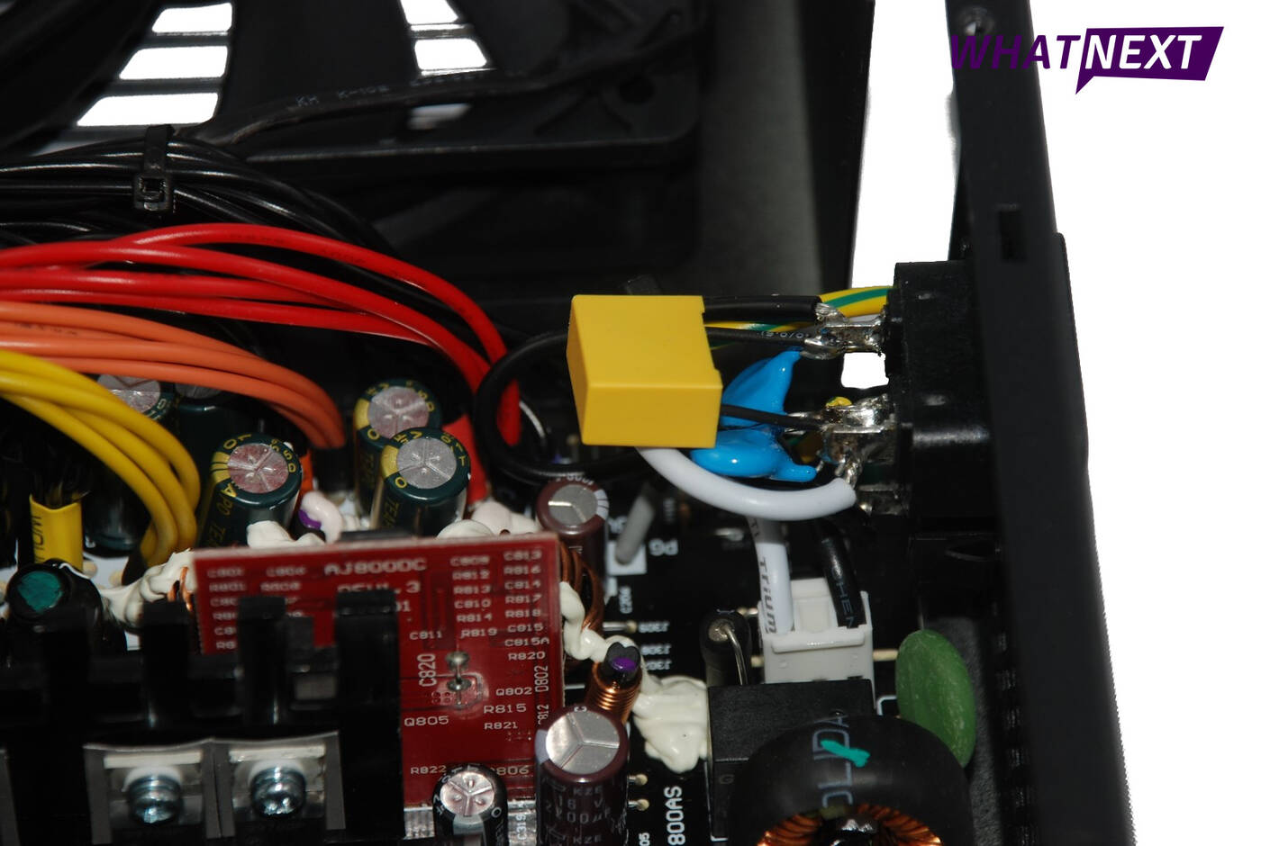 Za chłodzenie odpowiada 120 mm wentylator firmy Aobos, model AAL1225B1AN. Jego maksymalna prędkość obrotowa wynosi 1600 RPM więc nie powinien on być mocno hałaśliwy. W środku można zauważyć także dwa czarne radiatory. Generalnie wnętrze zostało zaprojektowane dobrze. Widać, że jest wiele miejsca do cyrkulacji powietrza. Największy kondensator ma parametry 450V oraz 270 uF i może pracować w temperaturze do 105°C. Został on wykonany przez firmę Teapo. Pozostałe kondensatory są elektrolityczne i aluminiowo-polimerowe oraz są produkcji tajwańskiej lub japońskiej. Zasilacz stosuje także konwerter DC-DC. Wykonanie jest dobre, choć gdzieniegdzie uważam że można by było bardziej się postarać. Zasilacz posiada także następujące zabezpieczenia: OVP (zabezpieczenie przed zbyt wysokim napięciem na wyjściu), SCP (zabezpieczenie przeciwzwarciowe), SIP (zabezpieczenie przed nieprzewidzianymi prądami udarowymi), OPP (zabezpieczenie przed przeciążeniem), UVP (zabezpieczenie przed zbyt niskim napięciem na wyjściu).