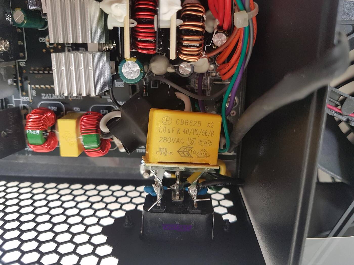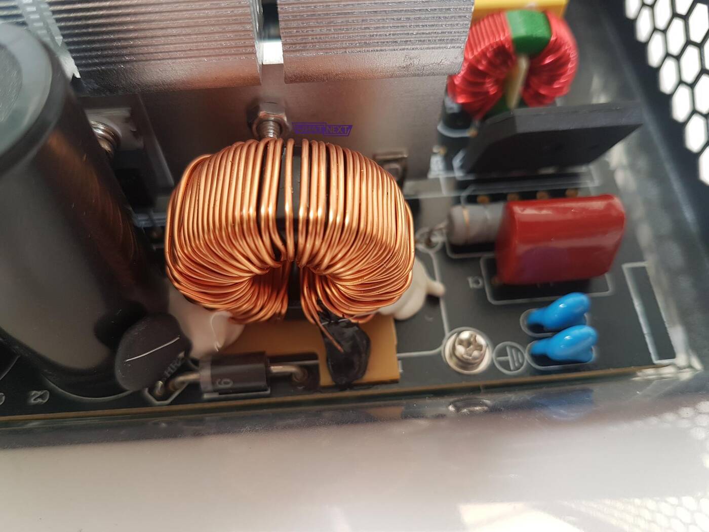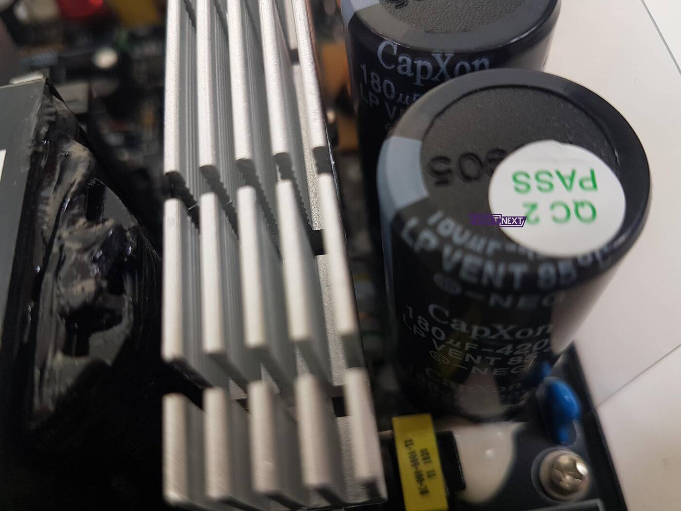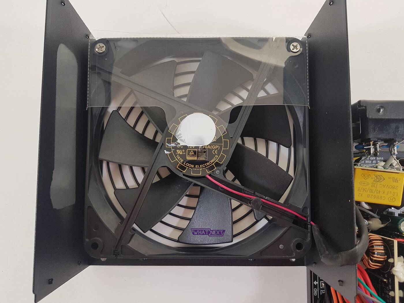 Zasilacz posiada zamontowany 140 mm wentylator firmy Yate Loon Electronic. Modelu nie jesteśmy w stanie Wam podać ze względu na przysłonięcie go klejem. Generalnie w środku znajduje się mnóstwo kleju, który jest praktycznie wszędzie obecny. Już po tym widać, że jest to raczej tańsza konstrukcja. Największe kondensatory są produkcji CapXon i mają parametry 420 V, 180 uF i pracują w temperaturze do 85°C. Producent mówi także o przetwornicy DC-DC czy aktywnym PFC. Zastosowane zabezpieczenia to: OVP (zabezpieczenie przed zbyt wysokim napięciem na wyjściu), UVP (zabezpieczenie przed zbyt niskim napięciem na wyjściu), SCP (zabezpieczenie przeciwzwarciowe) oraz OPP (zabezpieczenie przed przeciążeniem) .