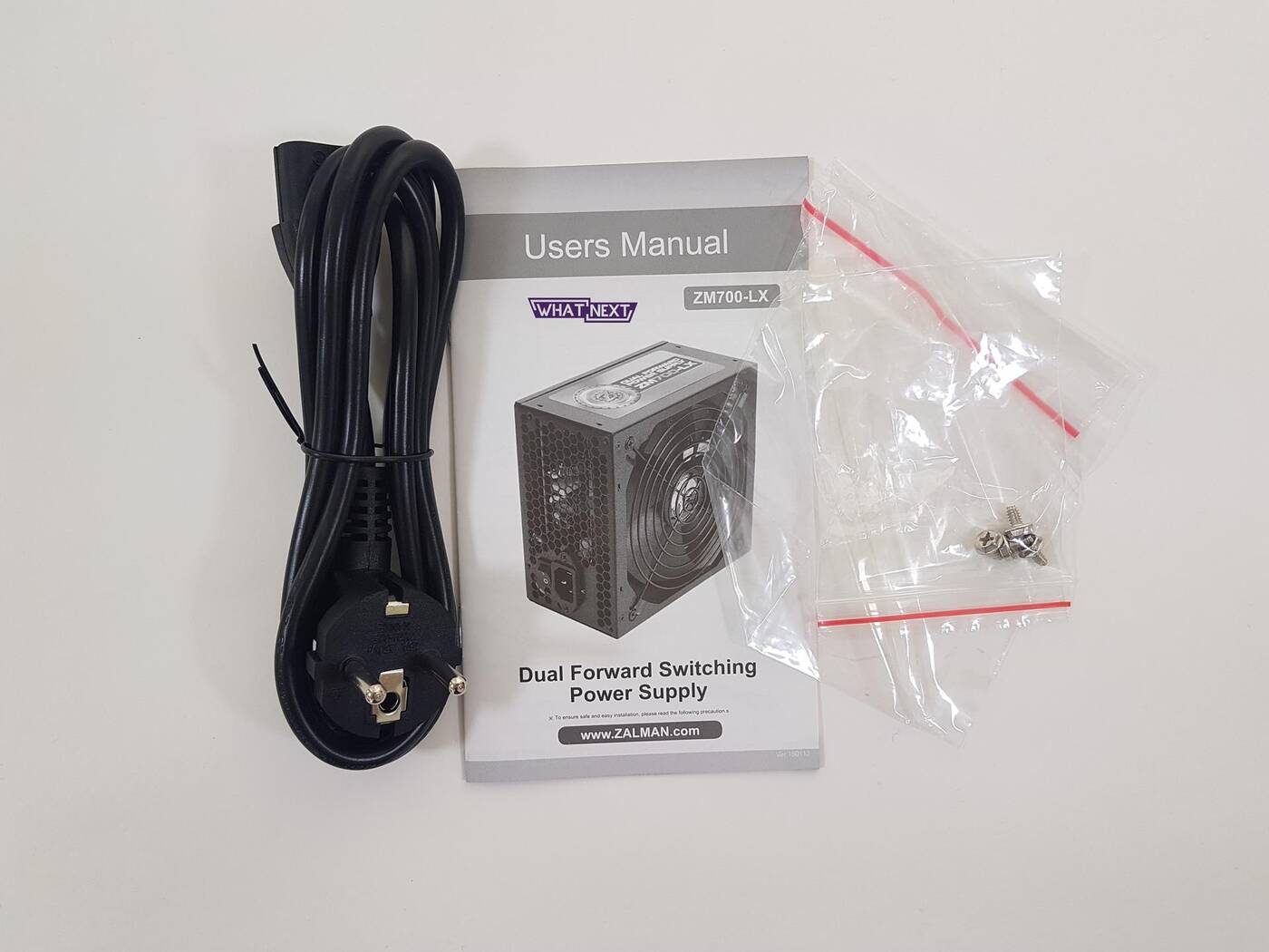 Całe okablowanie wychodzi bezpośrednio z Zalmana ZM700-LX. Do dyspozycji są następujące wiązki: jedna ATX 20+4 pin (550 mm), jedna CPU 4+4 pin (600 mm), dwie 2x PCI-E 6+2 pin (500 mm do pierwszej wtyczki, odległość pomiędzy kolejnymi wynosi 150 mm), dwie 3x SATA (500 mm do pierwszej wtyczki, odległość pomiędzy kolejnymi wynosi 150 mm) oraz dwie 3x Molex (500 mm do pierwszej wtyczki, odległość pomiędzy kolejnymi wynosi 150 mm).