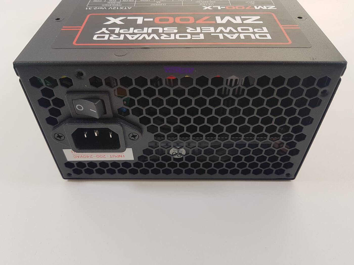 Zasilacz wygląda całkowicie normalnie – nic go nie wyróżnia. Jego dokładne wymiary to 160 x 150 x 85 mm. Z tyłu standardowo znajduje się włącznik, wejście na kabel zasilający oraz otwory w kształcie plastrów miodu. Wejście obsługuje napięcia od 200 do 240 VAC. Na górze znajduje się standardowy grill – nic specjalnego. Na jednym z boków znajduje się naklejka z nazwą serii a na spodzie umieszczona została tabliczka znamionowa. Do dyspozycji jest jedna linia +12V o prądzie 58 A i mocy 696 W. Linie +5V i + 3,3V można obciążyć po 20 A, łącznie 140 W. Łączna moc zasilacza to 700 W.