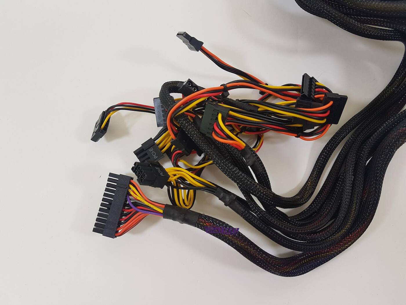 Brakuje mi tutaj paru rzeczy. Fajnie byłoby, gdyby obecne były mieszane wiązki. Również oraz więcej płyt posiada większą ilość złączy CPU więc przy tej mocy dwie wtyczki 8 pin byłyby mile widziane. Po trzecie kable mają oplot jedynie do pierwszej wtyczki, potem zaczyna być już kolorowo. Estetycznie wygląda to tragicznie.