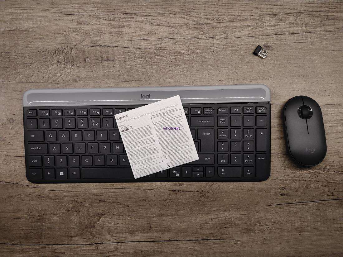Swoją przygodę z tym zestawem zaczynamy dosyć skromnie. Proste kartonowe opakowanie zgodne z językiem projektowym Logitecha skrywa w sobie zabezpieczoną folią klawiaturę i myszkę. Poza tymi głównymi bohaterami otrzymujemy też wymagany do połączenia radiowy odbiornik USB 2,4 GHz z zasięgiem do 10 metrów oraz informacje na temat gwarancji.