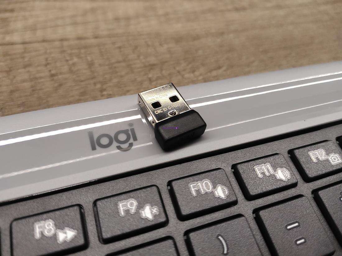 W przypadku klawiatury mamy do czynienia z dość standardową bryłą, ale z ewidentnym wydłużeniem na samej górze. Ta wstawka w jaśniejszym w porównaniu z grafitem całości jest wykończona „na połysk” i ukrywa tak naprawdę dostęp do dwóch baterii i miejsca na odbiornik USB. Szkoda, że luki po lewej nie można wykorzystać (np. w formie schowka na długopis, ponieważ sama zaślepka jest w tym miejscu “pogrubiona”.