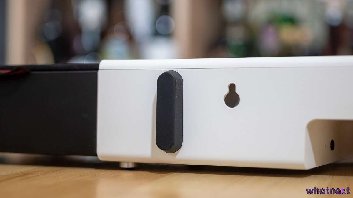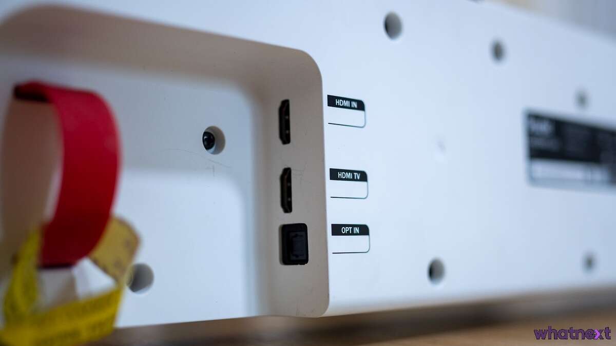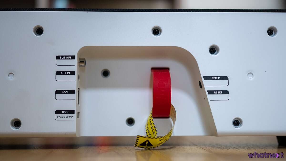 Omówienie tyłu soundbaru specjalnie przeniosłem do kolejnego rozdziału. Wszystkie łącza znajdują się w zagłębieniach, a wtyczki są umieszczone równolegle, a nie prostopadle do obudowy. Zagłębienia w połączeniu z gumowymi obejmami pozwalają utrzymać porządek w kablach.
