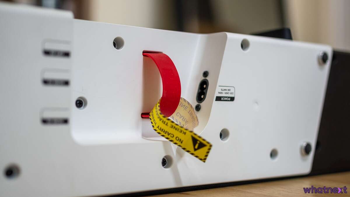 Cinebar Lux może pracować w pozycji stojącej, opiera się wtedy na niewielkich, acz solidnych gumowych nóżkach. Można go też powiesić. I tutaj również na tylnej ściance mamy gumowe wypustki, które ułatwiają podłączenie kabli i powodują, że obudowa nie ociera się o ścianę. Nawet taki element został rozwiązany w bardzo elegancki sposób.