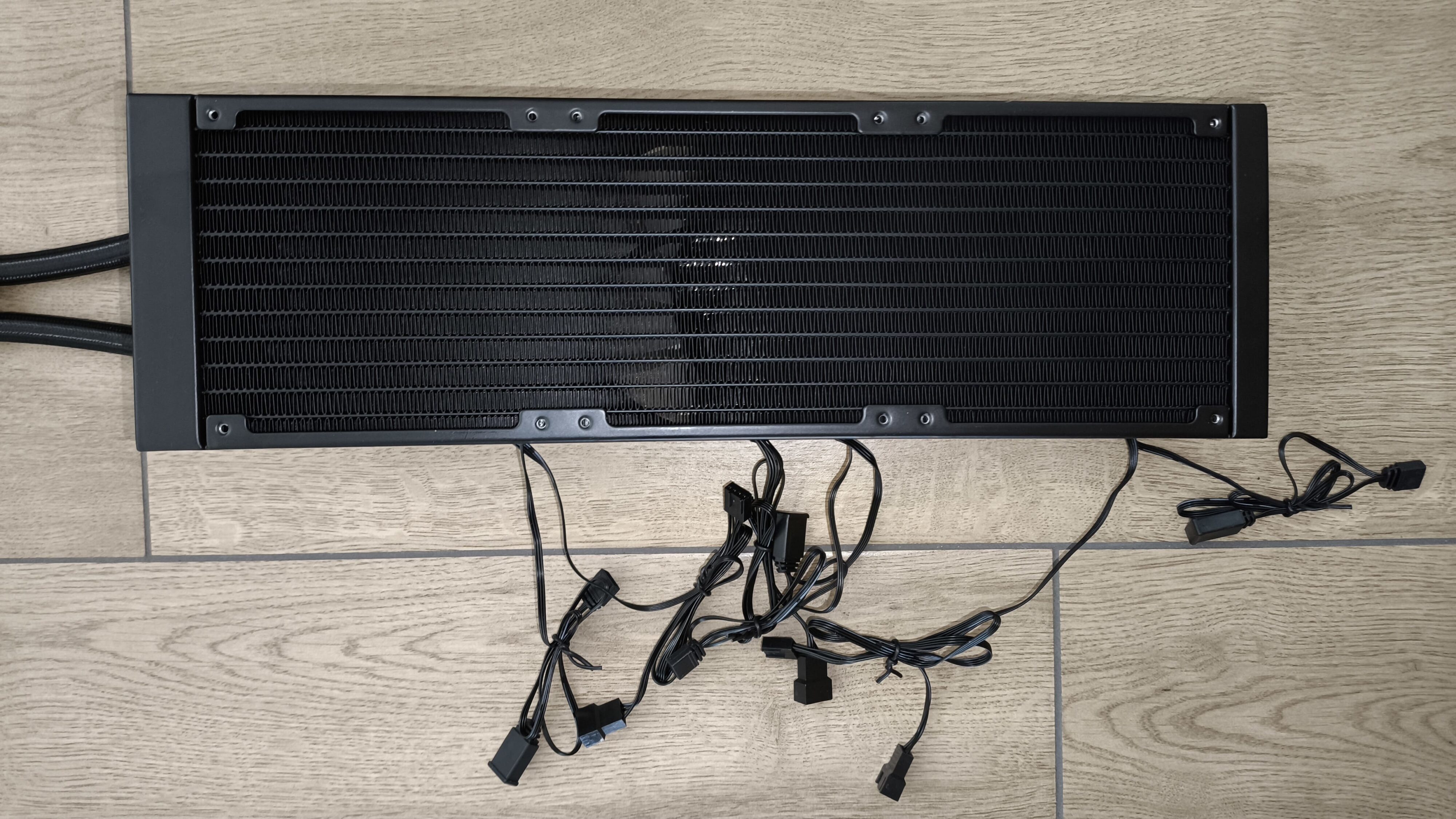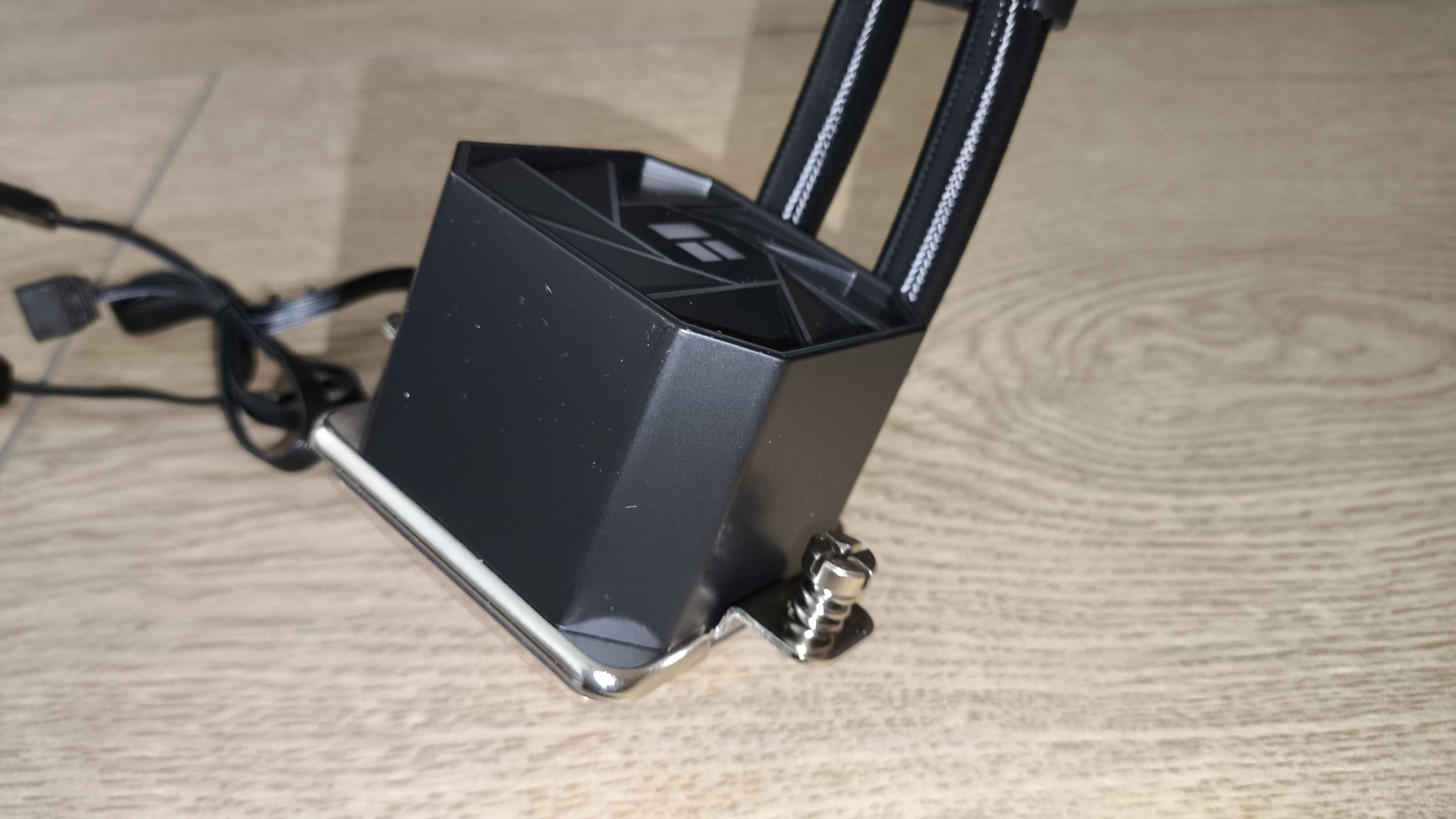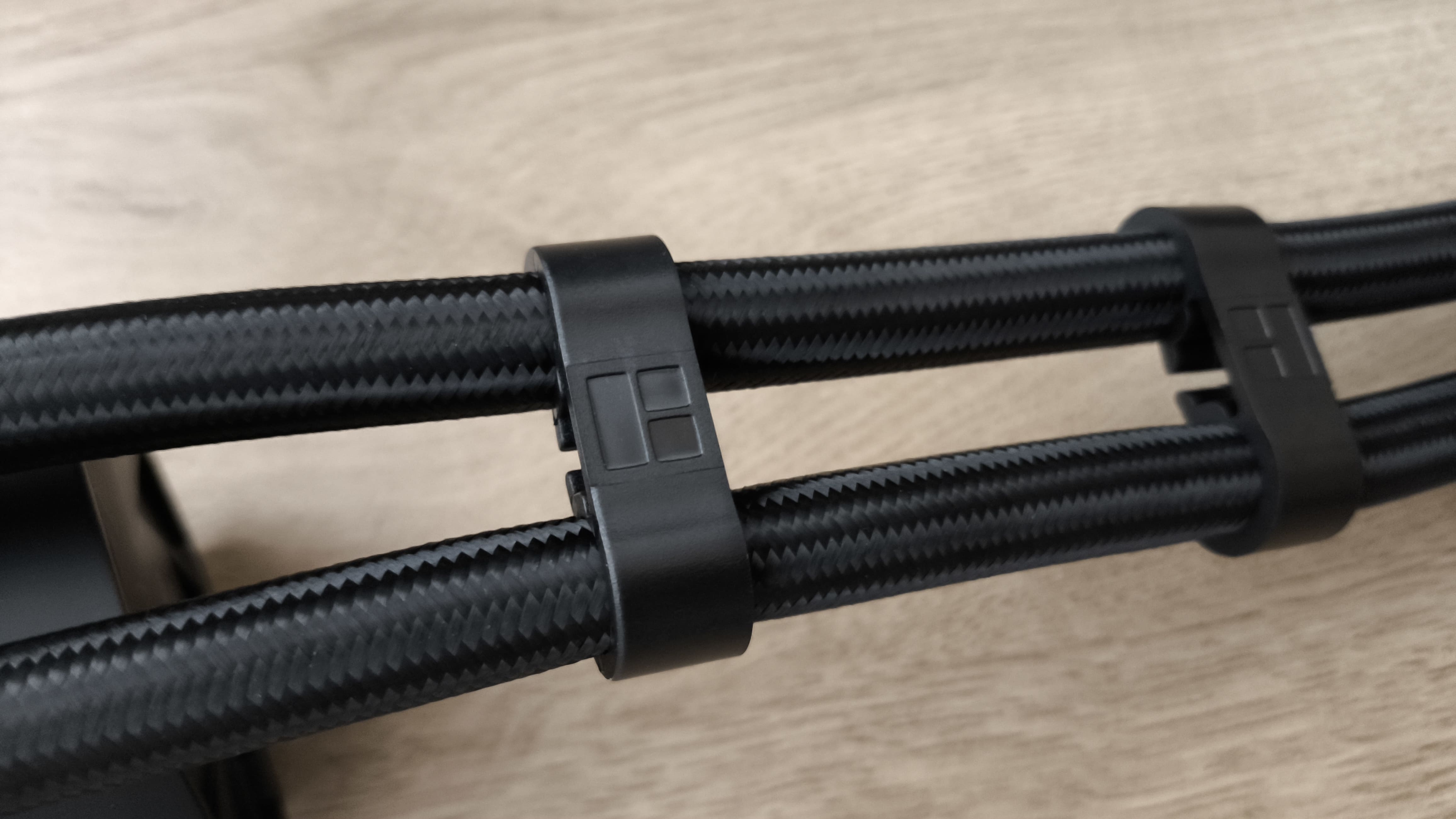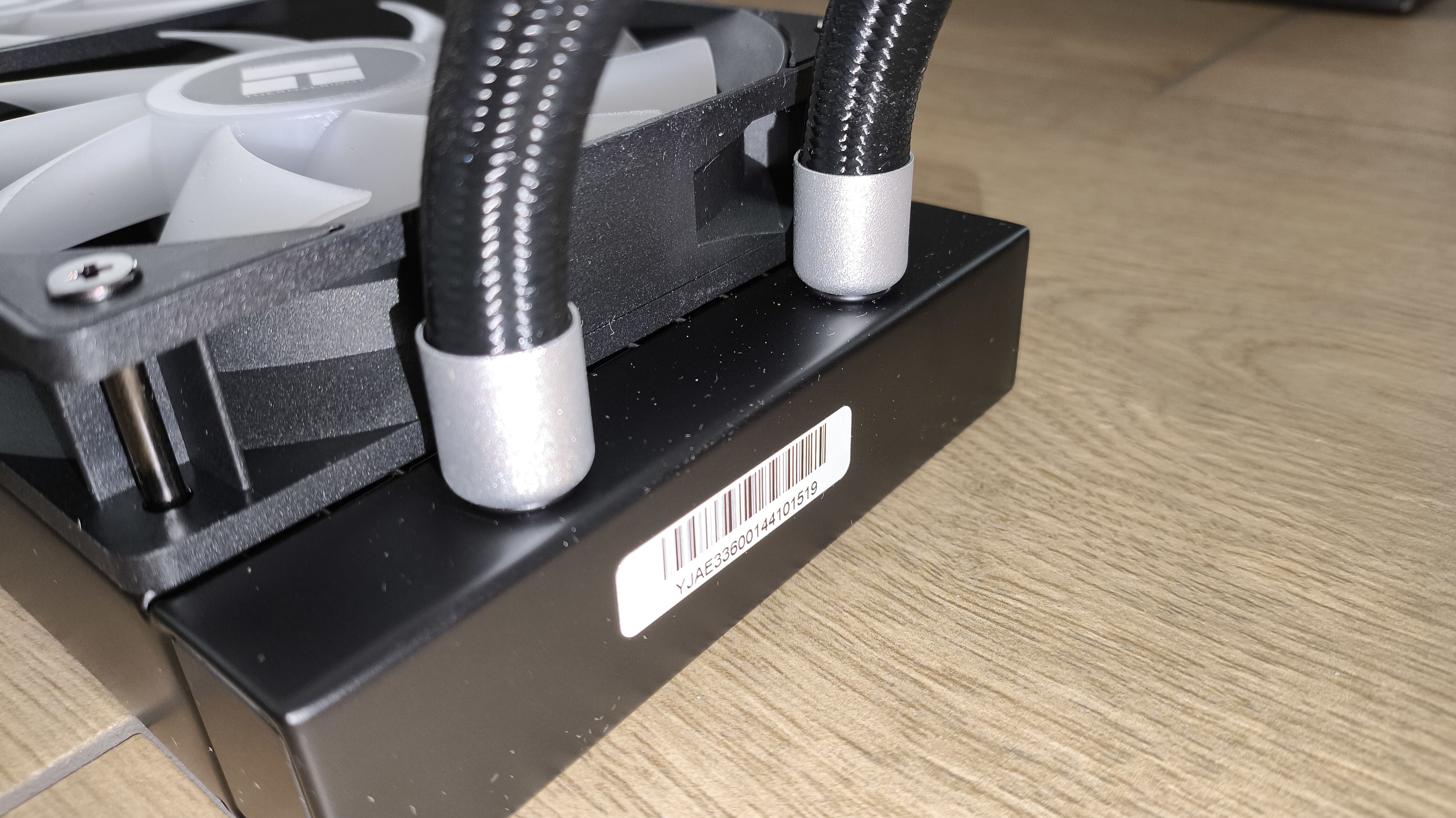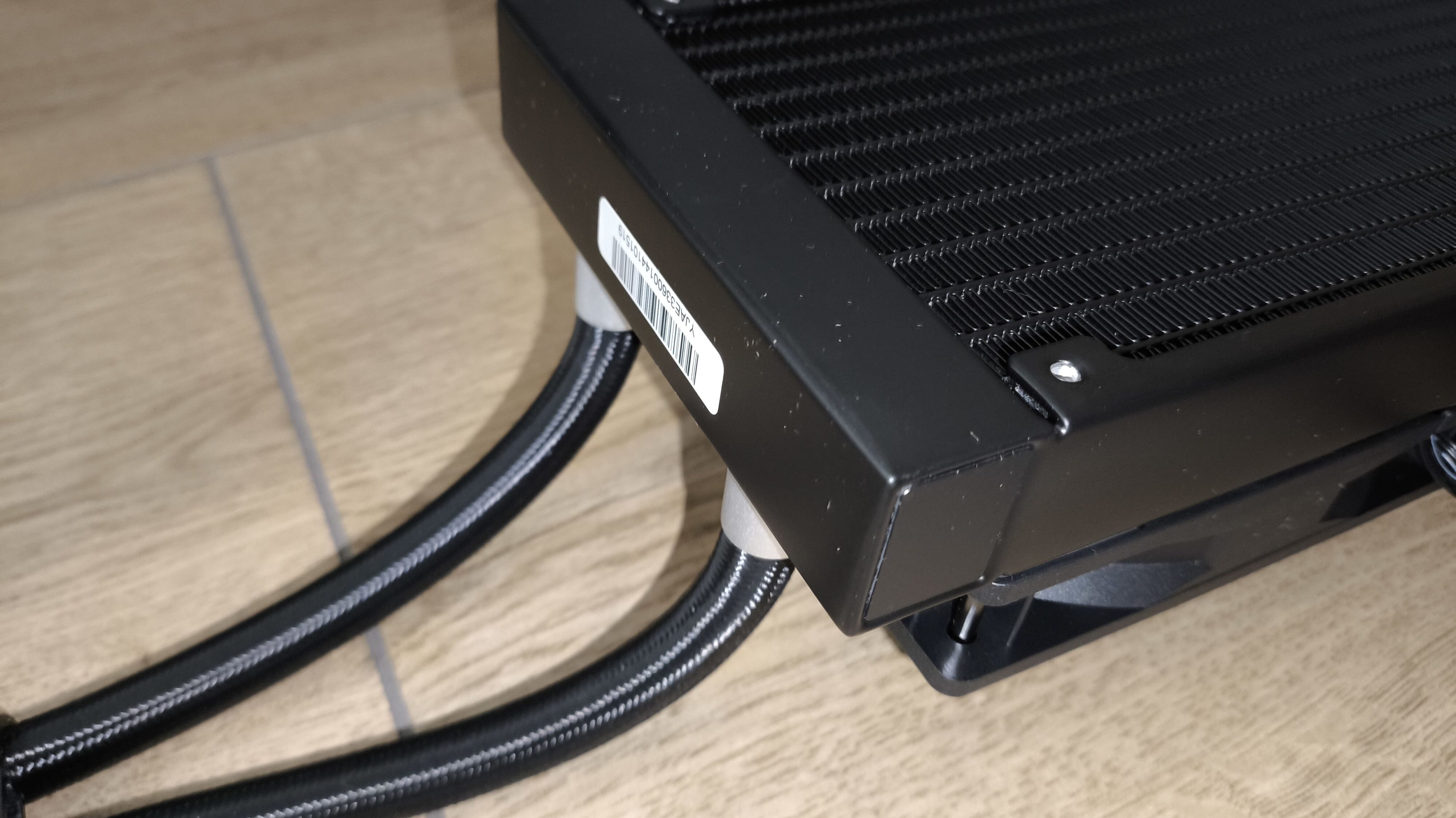 W zakresie detali warto wspomnieć o estetycznym kontraście – srebrne króćce prezentują się elegancko na tle całości. Dodatkowo przewody doprowadzające ciecz zabezpieczono czarnym nylonowym oplotem, który wizualnie poprawia wygląd karbowanych przewodów wykonanych z FEP. Ich długość wynosi 450 mm, co z zupełności wystarcza do wygodnej instalacji chłodnicy nawet w obudowach typu mid- i full-tower, bez ryzyka naprężeń czy zagięć.