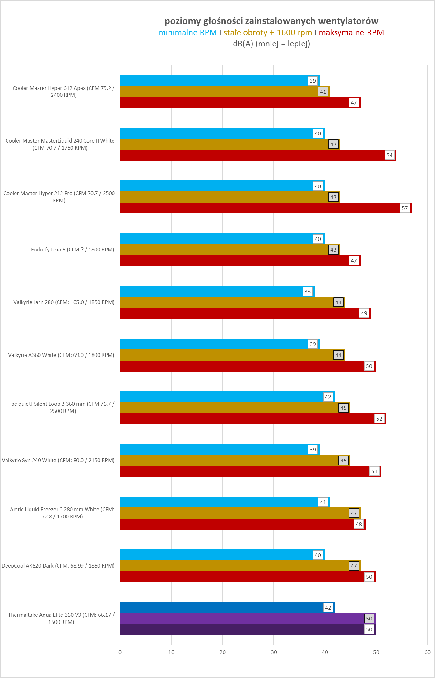Testy głośności chłodzenia / fabrycznych wentylatorów (z uwzględnieniem pracy pompy AIO na 100%)