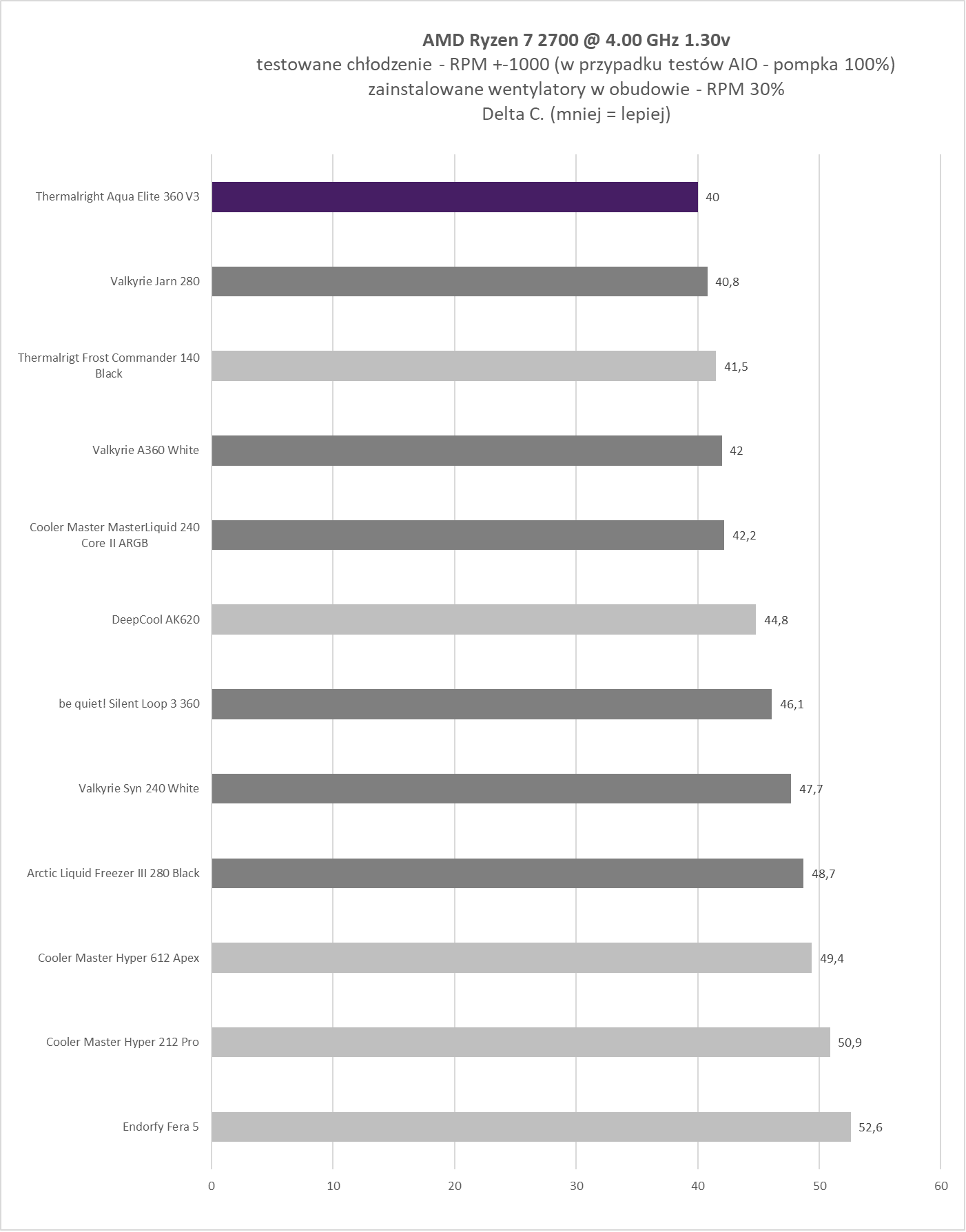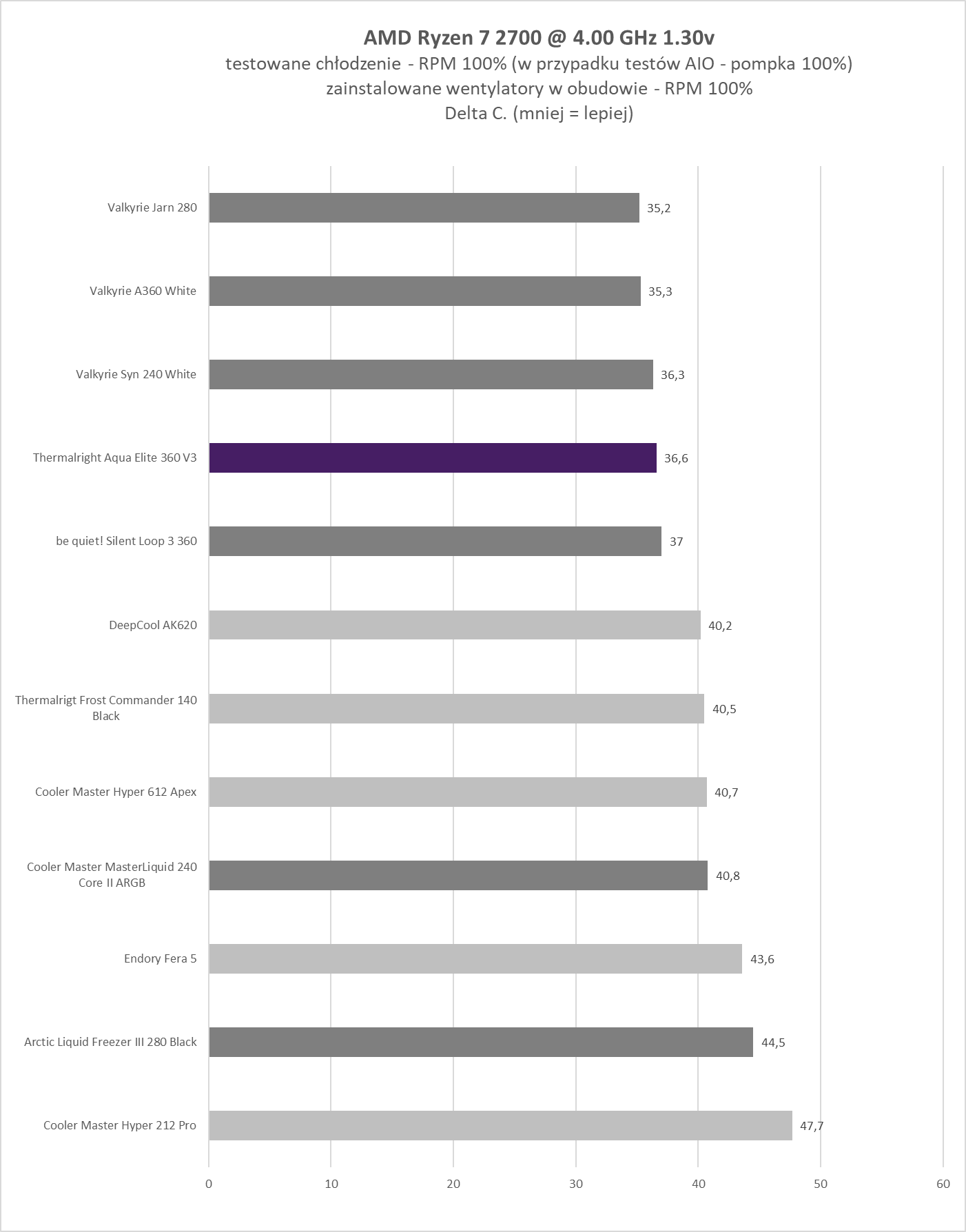 Pod względem wydajności model Aqua Elite 360 V3 prezentuje się znakomicie. Bez trudu radzi sobie z chłodzeniem testowego Ryzena 7 2700 @ 4 GHz, oferując niskie temperatury (co potwierdzają wyniki na wykresach). Co istotne, zestaw nie generuje nadmiernego hałasu – kultura pracy stoi na przyzwoitym poziomie (maksymalnie 50 dB(A) w testach). Choć nie jest całkowicie bezgłośny (w spoczynku osiąga ok. 41–42 dB(A)), jego charakterystyka akustyczna pozostaje neutralna i pozbawiona irytujących tonów. W razie potrzeby użytkownik może łatwo dostosować krzywą wentylatorów wedle własnych preferencji.