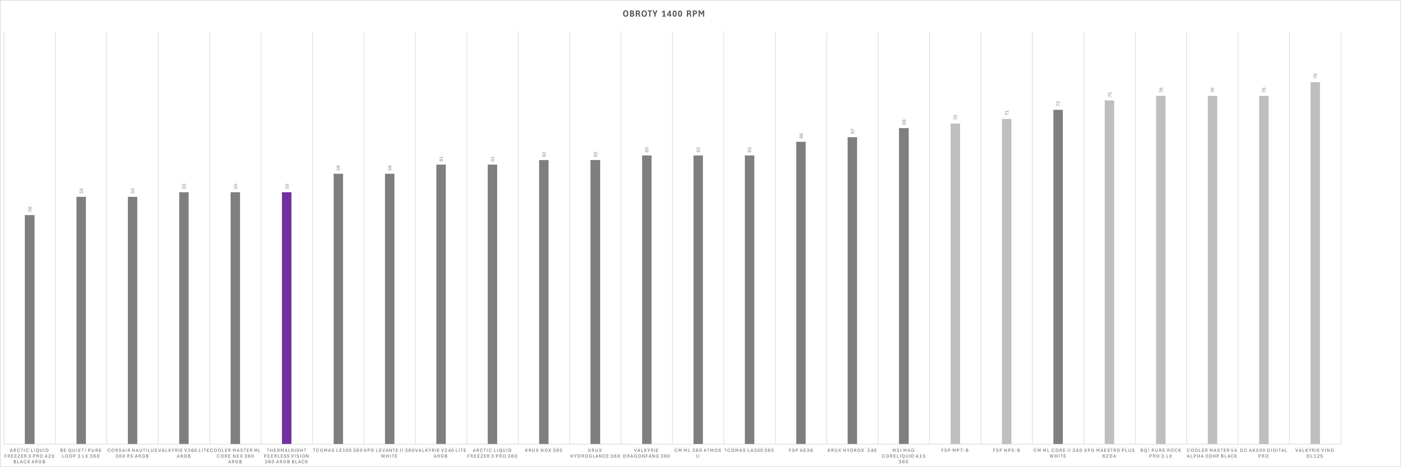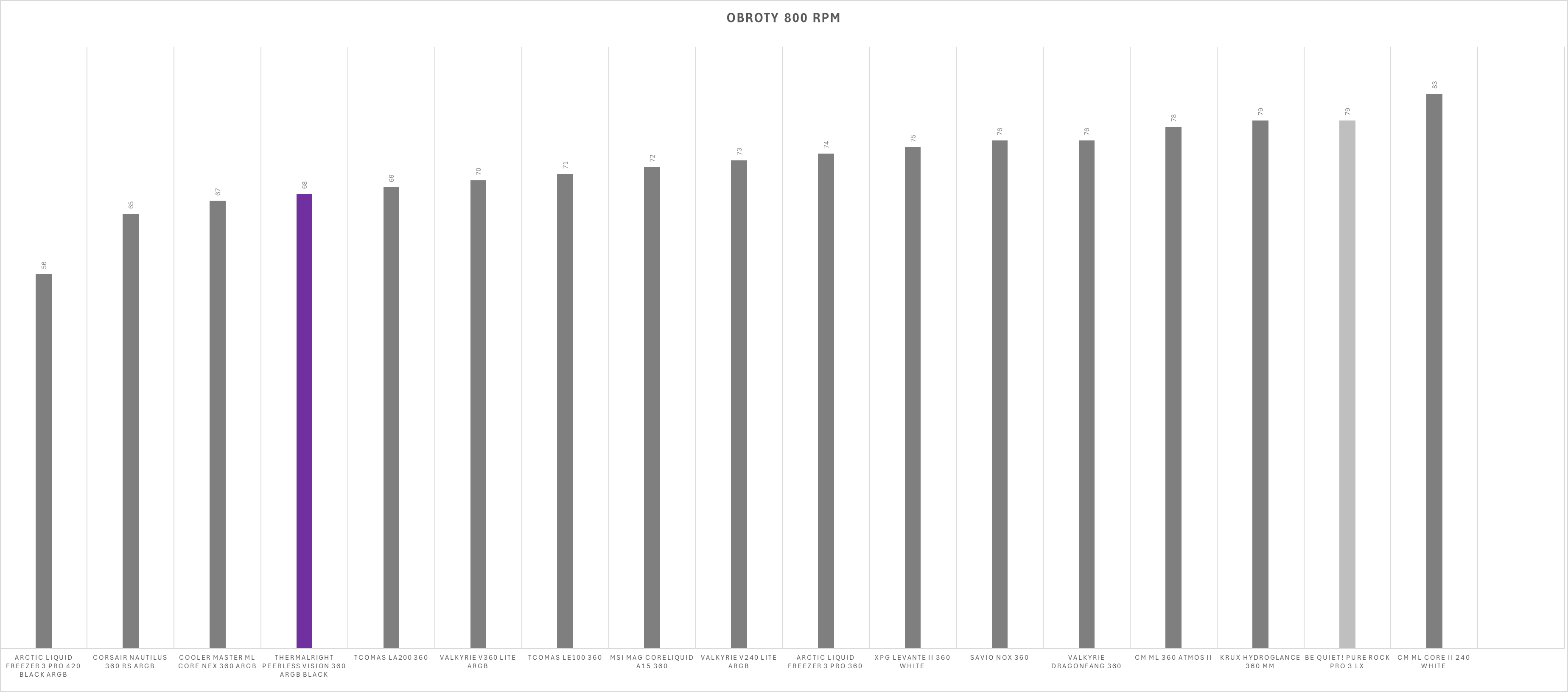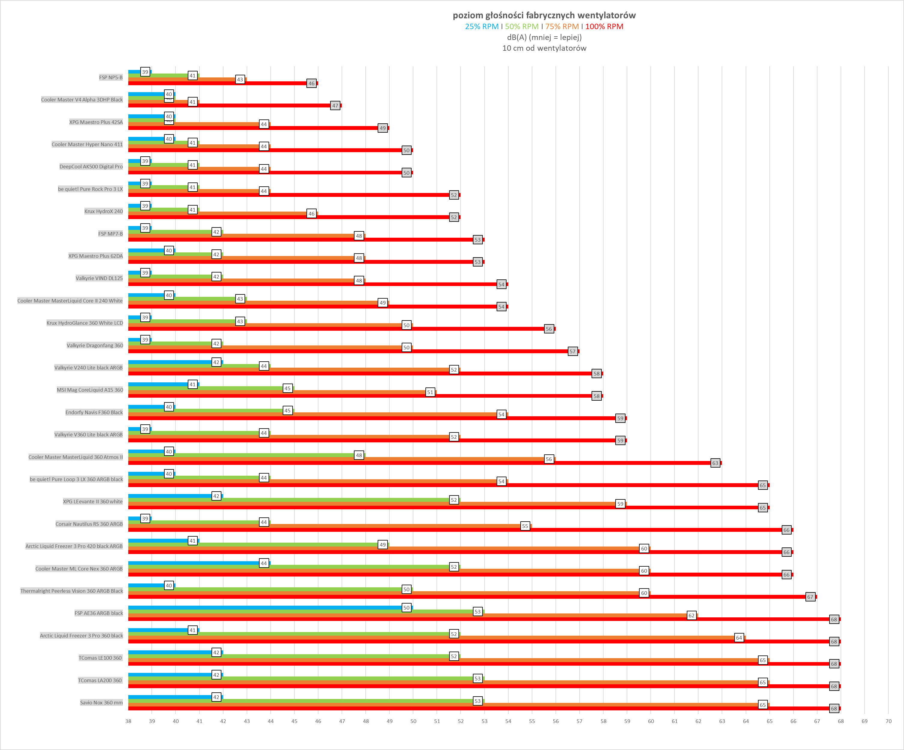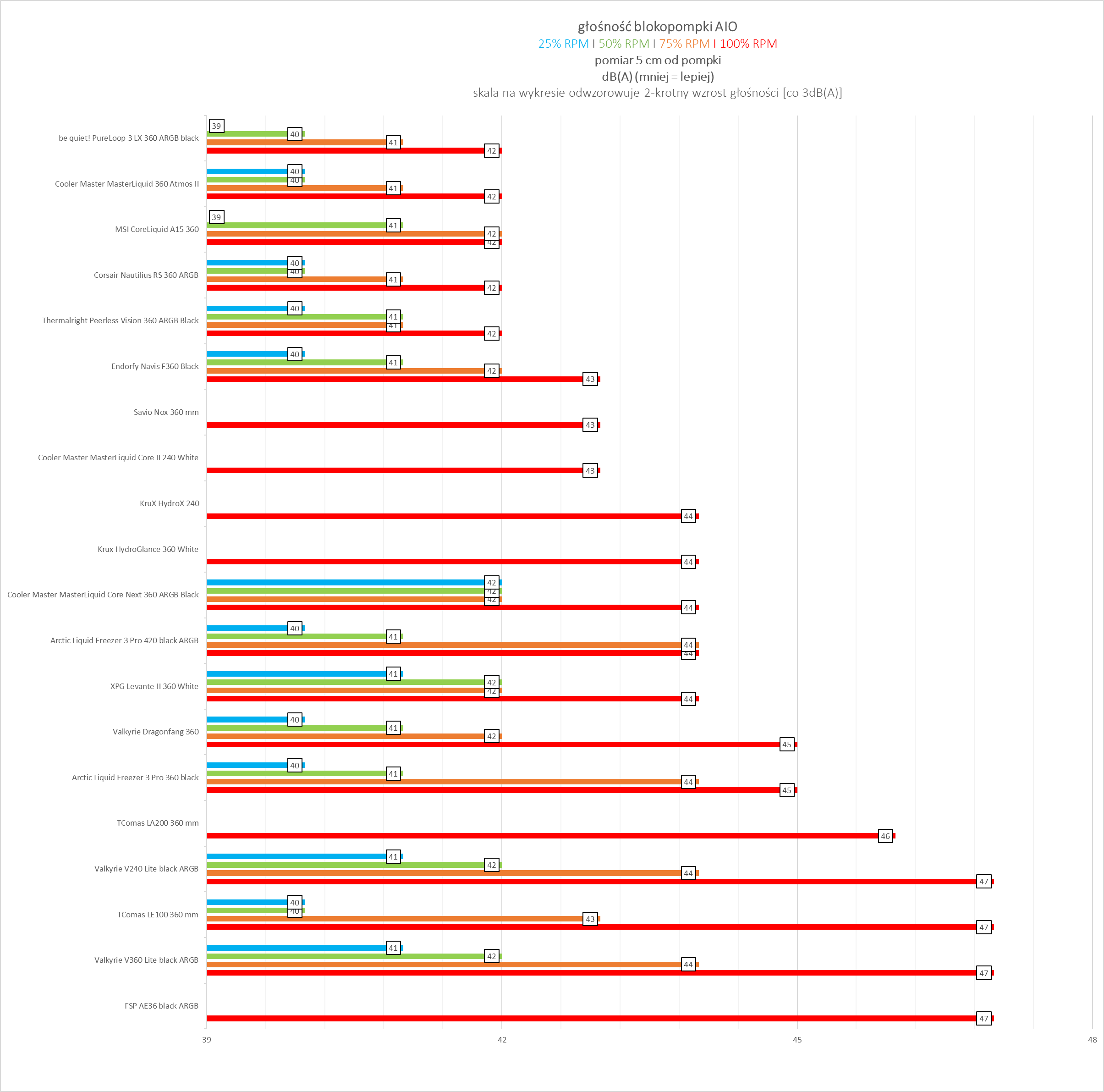 Na niższych i średnich obrotach zestaw pracuje zdecydowanie przyjemniej i nie wybija się ponad standard dla tej klasy AiO. Na plus należy zaliczyć także zwartą konstrukcję wentylatorów (brak szczelin między nimi), co ogranicza niepożądane turbulencje. Sama pompa nie wyróżnia się negatywnie – nie generuje irytujących dźwięków i nie zwraca na siebie uwagi podczas normalnej pracy.