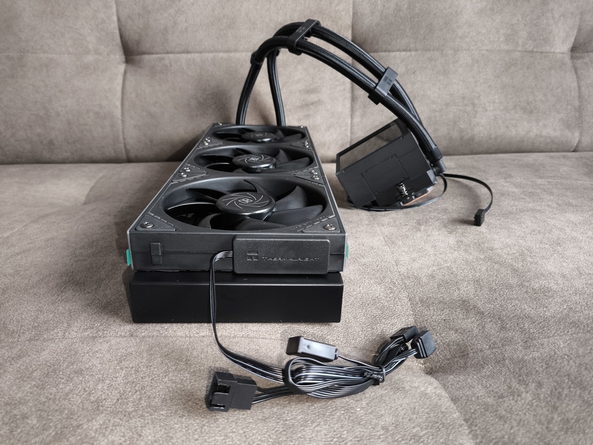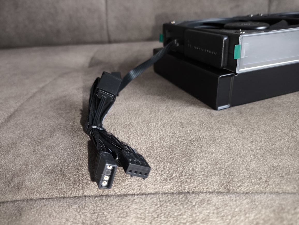 Jednym z ciekawszych rozwiązań jest sposób łączenia wentylatorów. Tworzą one jednolity moduł, co pozwala ograniczyć okablowanie do minimum – z całego zestawu wyprowadzono jedynie dwa przewody: jeden odpowiadający za zasilanie i sterowanie PWM, drugi za podświetlenie ARGB. Znacząco ułatwia to zarządzanie kablami i poprawia estetykę wnętrza obudowy.